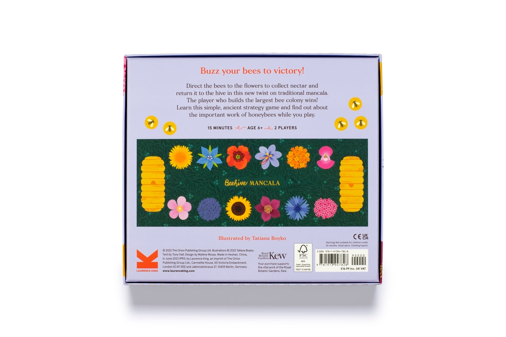 Buzz your bees to the flowers, collect pollen, and return to the hive to make honey — the player who grows the largest colony wins! Beehive Mancala: A Nature Board Game puts a stunning natural twist on the ancient strategy game of mancala, with bespoke illustrations by Tatiana Boyko and educational bee facts contributed by the beekeeper at the Royal Botanic Gardens, Kew.