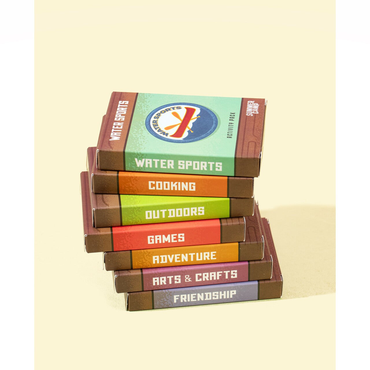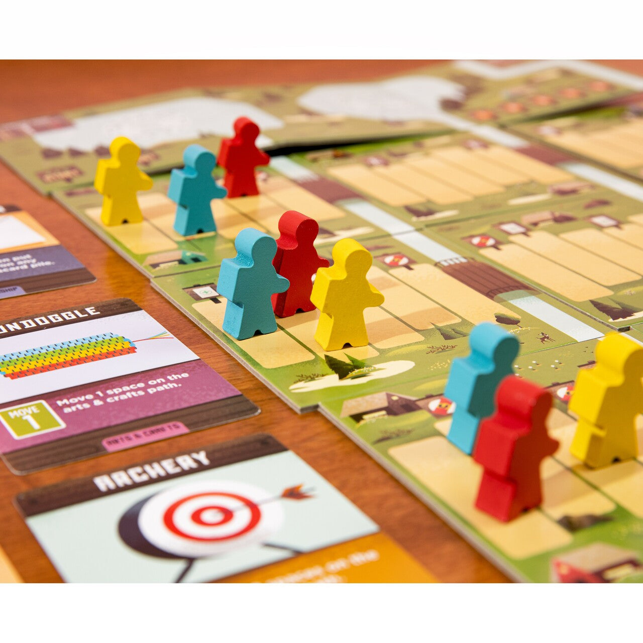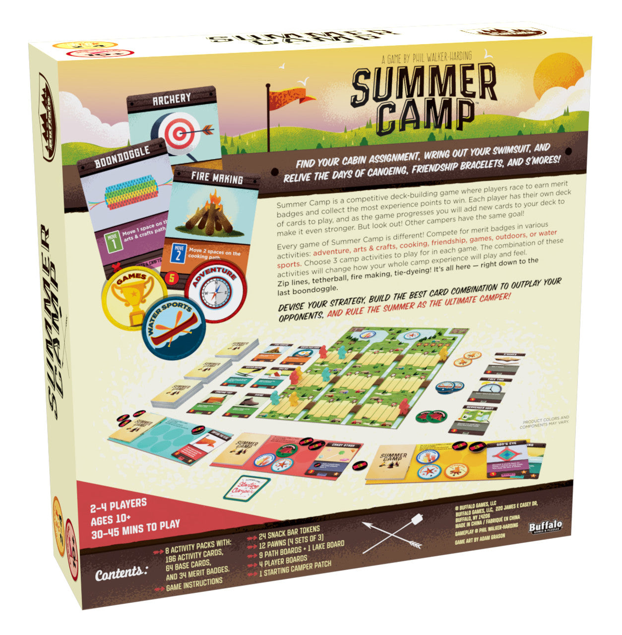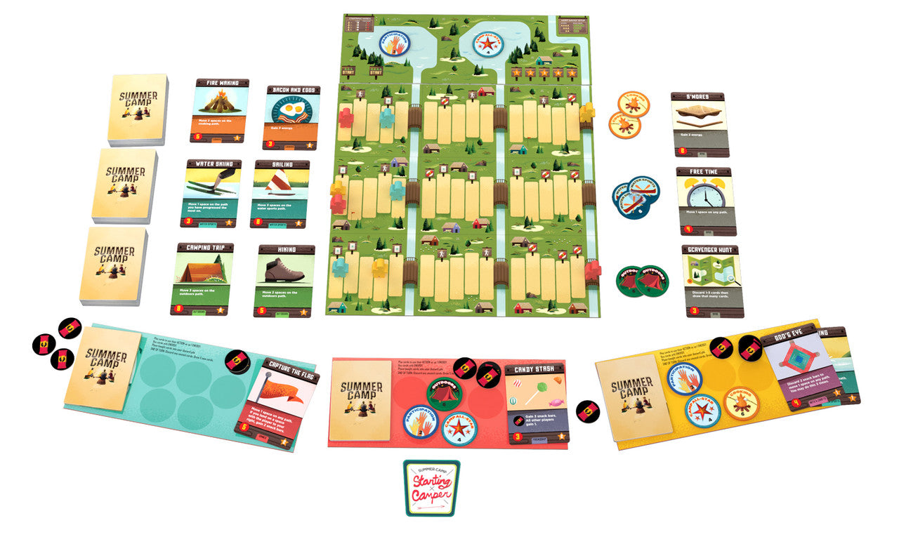 - Game Contents: 8 activity packs with: 196 activity cards, 64 base cards, and 34 merit badges, game instructions, 24 snack bar tokens, 12 pawns (4 sets of 3), 9 path boards and 1 lake board, 4 player boards, 1 starting camper patch