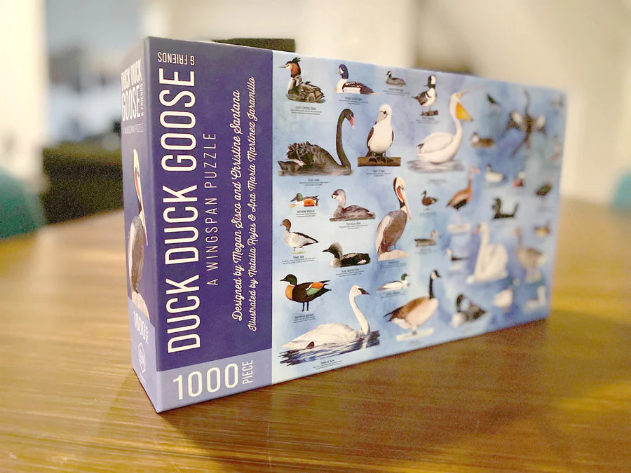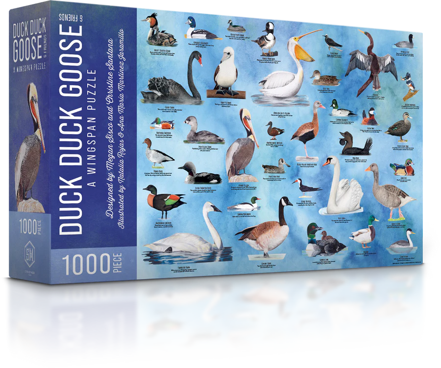 Duck Duck Goose is an intermediate-level 1000-piece jigsaw puzzle designed specifically for Wingspan by Megan Sisco and Christine Santana, with a completed size of 67cm (wide) by 48cm (high).