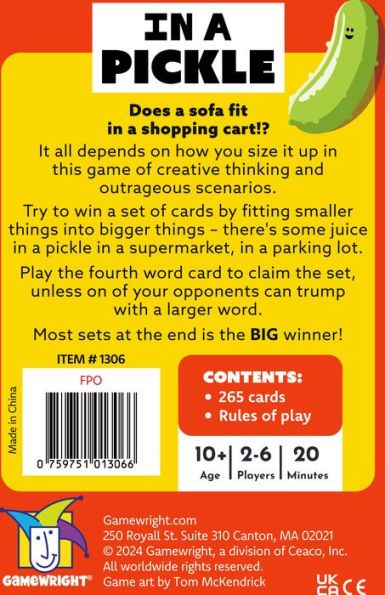 Does a sofa fit into a shopping cart? It all depends on how you size it up in this game of creative thinking and outrageous scenarios. Fit smaller things into bigger things a baby goes in a bathtub, which is in a house, in Hollywood. Win a row of cards by playing the largest object, unless an opponent trumps with something even bigger! Claim the most sets and you're the BIG winner!