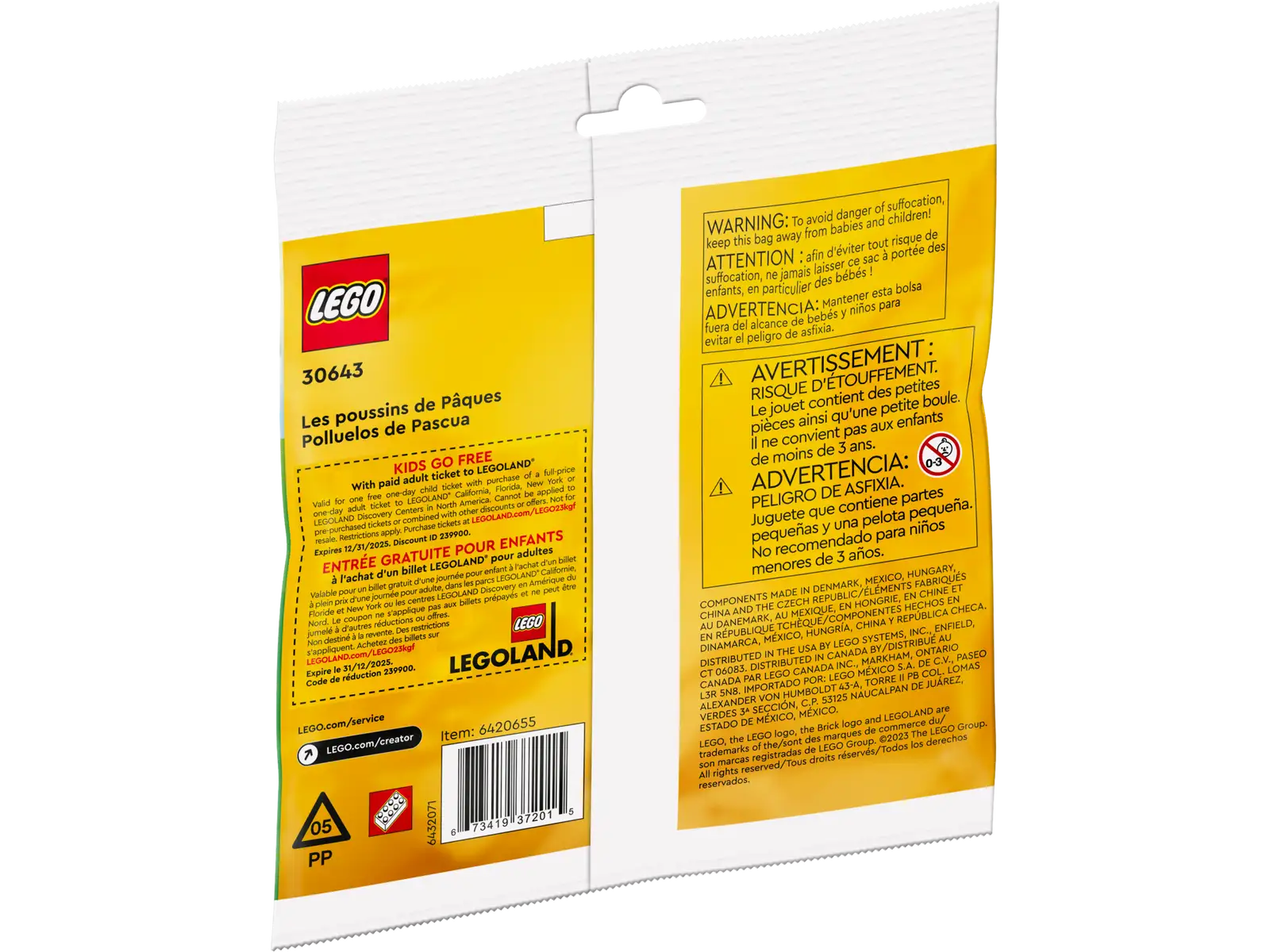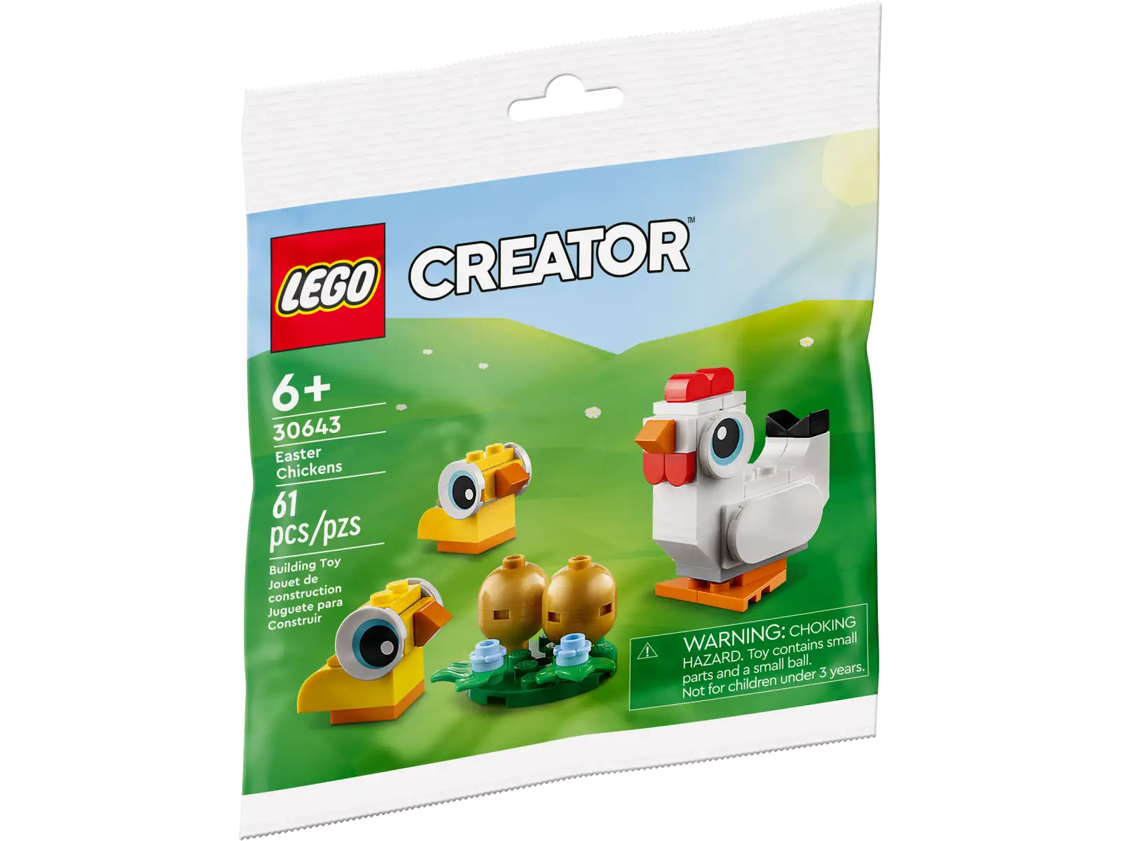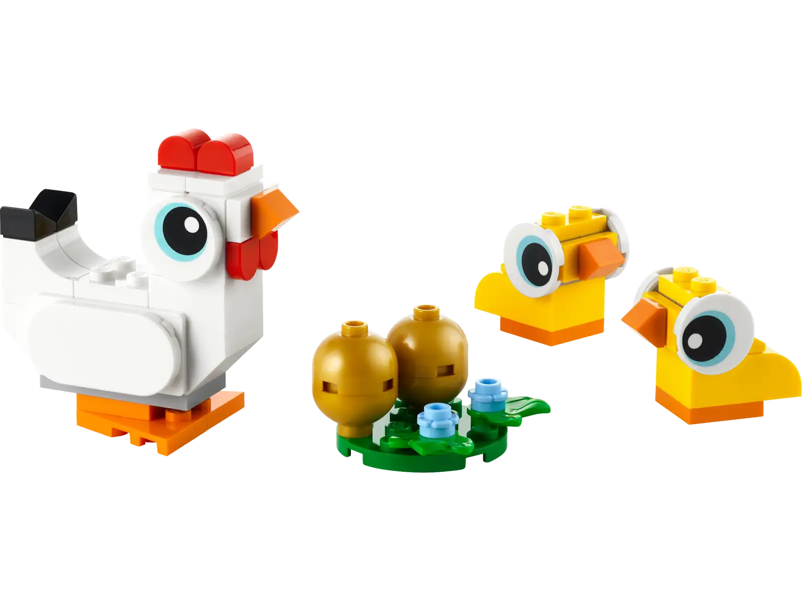 Build and display this cute scene of a white hen with 2 chicks and 2 golden eggs that can be opened.