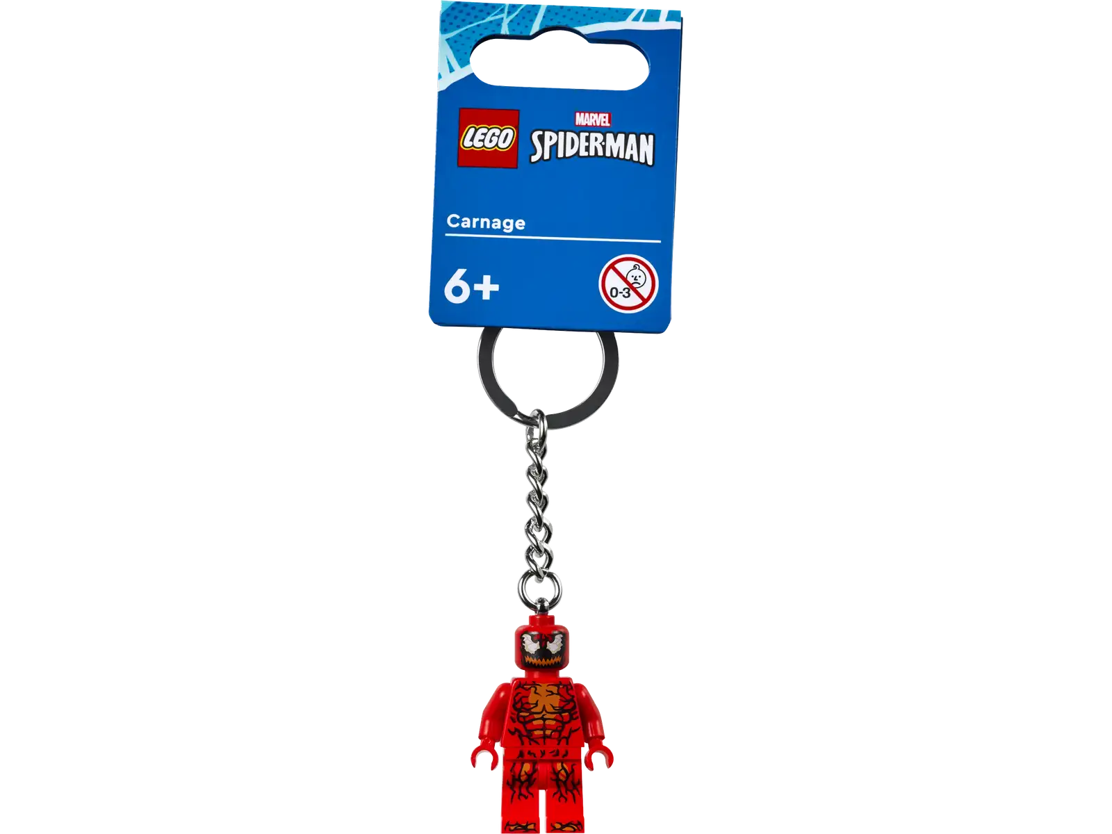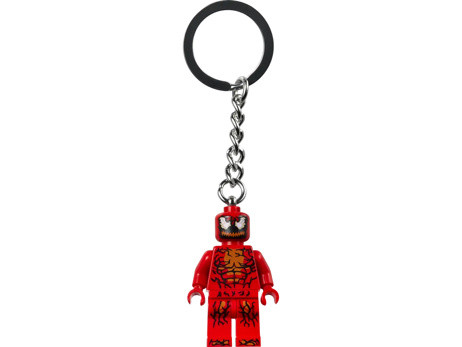 - LEGO® minifigure key chain – A Carnage minifigure with posable head, arms and hands is attached to a durable metal chain and key ring. The minifigure is not detachable from the chain
