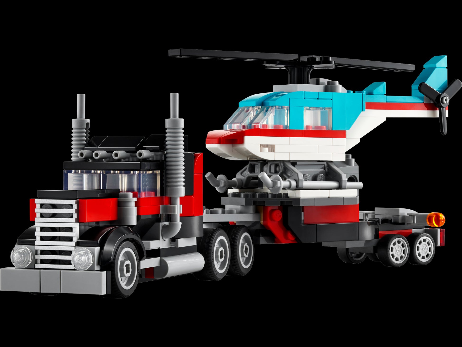 Look up at the sky! A helicopter is about to land on the back of a truck. Once it has touched down, rebuild the LEGO® Creator Flatbed Truck with Helicopter into a powerful propeller plane and a fuel truck or turn it into a hot rod racing car and an SUV to stage thrilling races. You can even fire up your imagination and create your own vehicles. The action never stops with this 3in1 vehicle set!