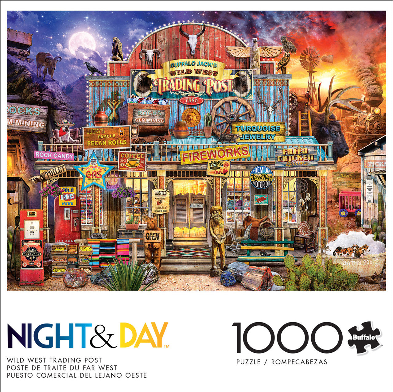 This 1000-piece jigsaw puzzle, Wild West Trading Post, is from the Night & Day Series by Buffalo Games. Piece together the essence of a bustling trading post filled with fireworks, flavorful coffees, and mouthwatering fried chicken. The sky behind showcases the beauties of the desert from night to day, with towering mountains, desert cacti, playful wildlife, and a passing train.