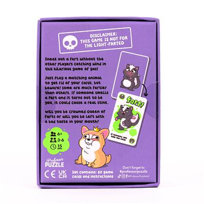 Sneak out a fart without the other players catching wind in this hilarious game of gas! Just play a matching animal to get rid of your cards, but beware! Some are much fartier than others. If someone smells a fart and it turns out to be you, it could cause a real stink. Will you be crowned Queen of Farts or will you be left with a bad taste in your mouth?