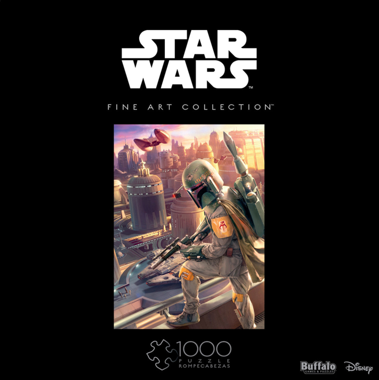 The 1000 Piece Star Wars Fine Art Collection Puzzle Series is crafted for the Star Wars fan. It features Star Wars Fine Art that captures the spirit and moments of all your favorite characters. This puzzle features Boba Fett, the famed bounty hunter, tracking Han Solo, Princess Leia, Chewbacca and C-3PO as they exit the Millennium Falcon below on Cloud City.
