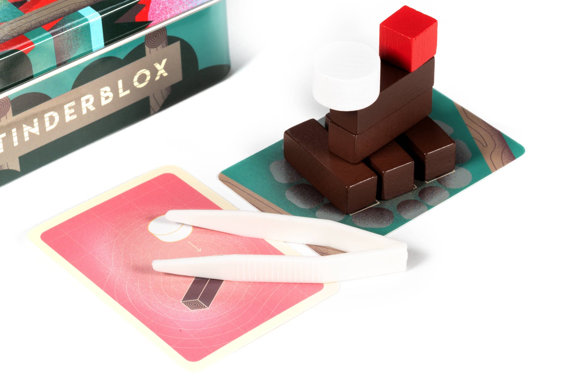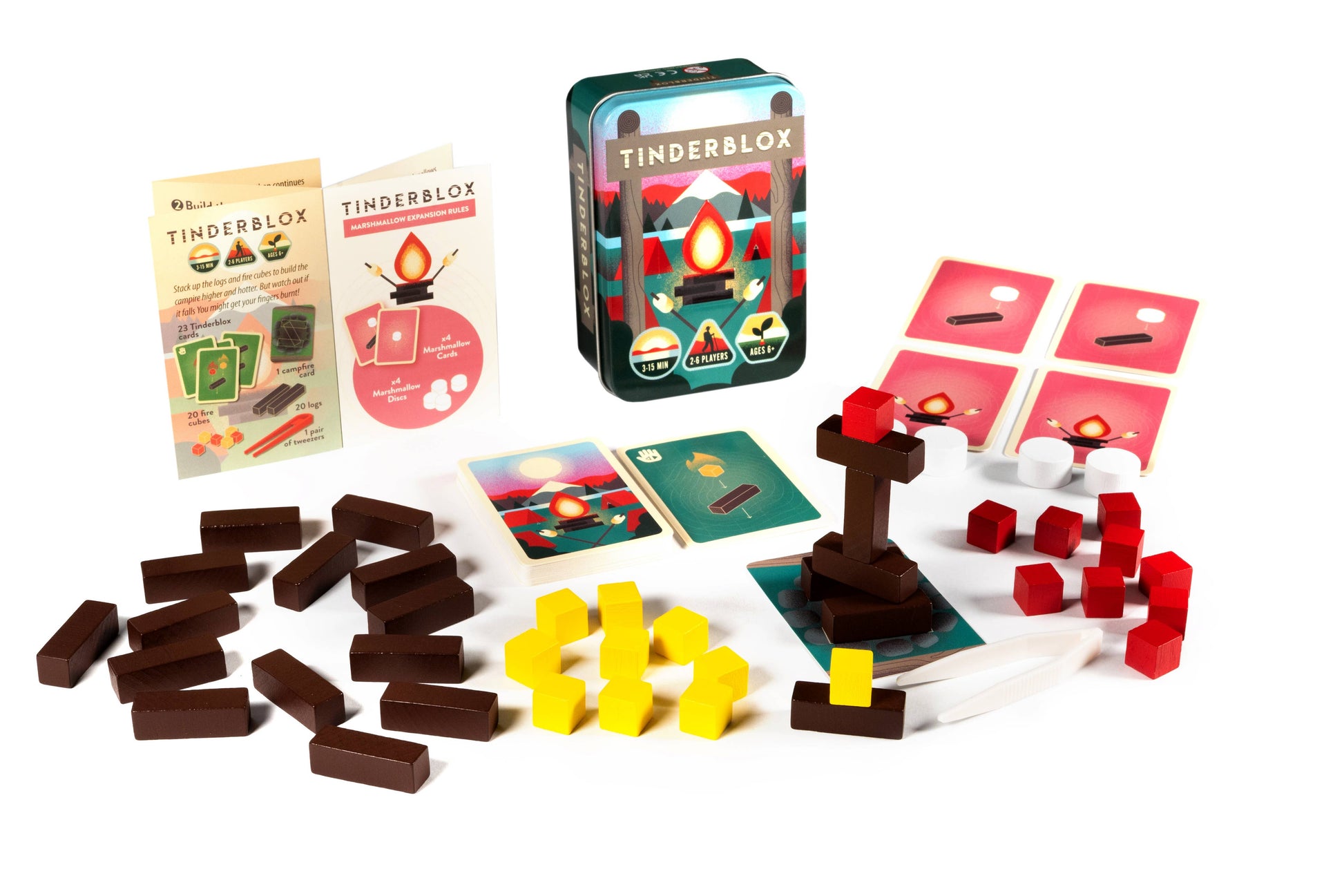 In this light dexterity game, carefully build up your campfire. Tinderblox is a mini-tin dexterity game where players are taking it in turns in a campfire-building competition. Be careful though, the bigger the campfire gets, the less stable it becomes. Can you handle the heat or will you be the one to cause the campfire to collapse?! Tinderblox Sunset is the new variant which is made from sustainably sourced wood and paper, and comes with the latest Marshmallow mini-expansion included! Tinderblox Sunset is also not shrink-wrapped and has not used ziplock bags to minimise plastic waste.