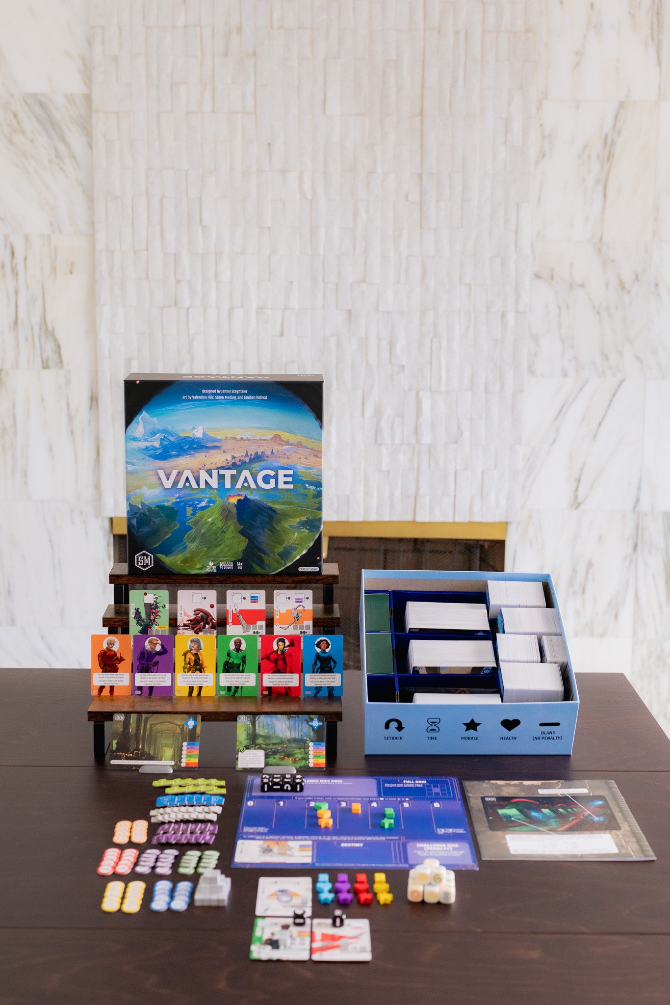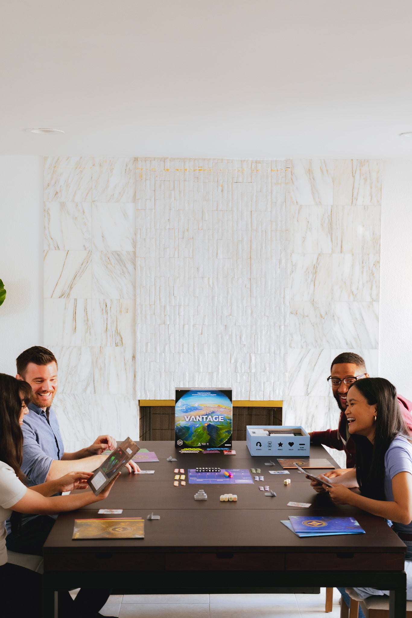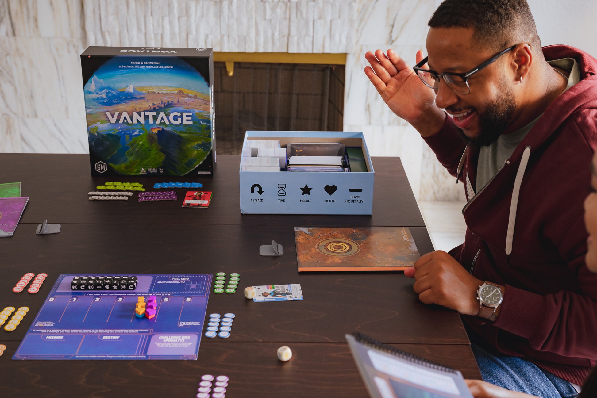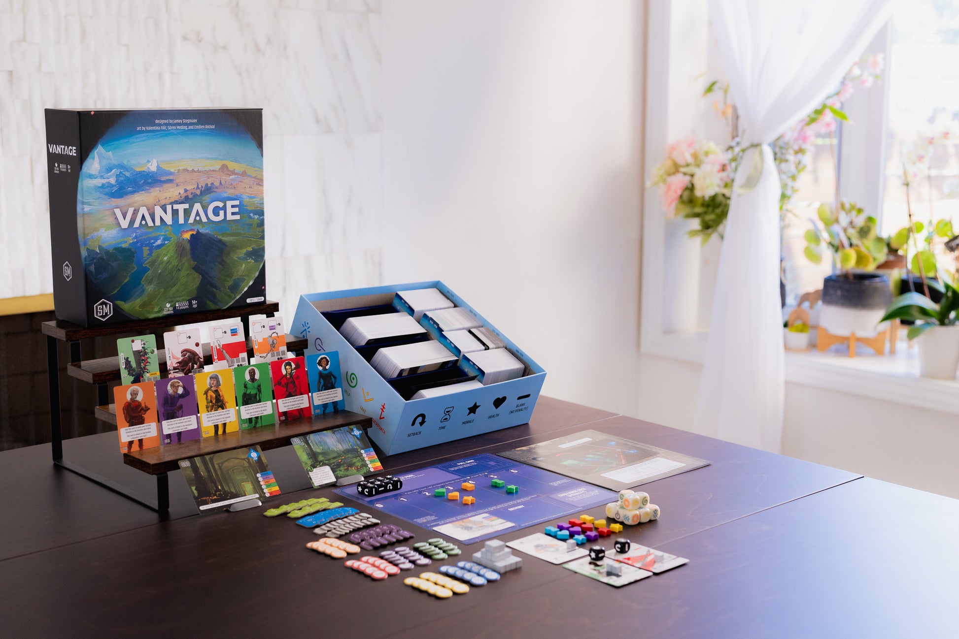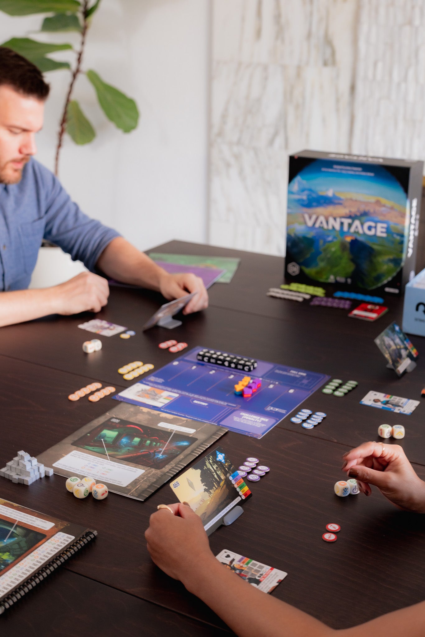 Stonemaier’s Vantage is an open-world, cooperative adventure game featuring an entire planet to explore in standalone sessions that begin with players scattered randomly across the world. With nearly 800 interconnected locations on cards and over 900 other discoverable cards, the world is your sandbox.