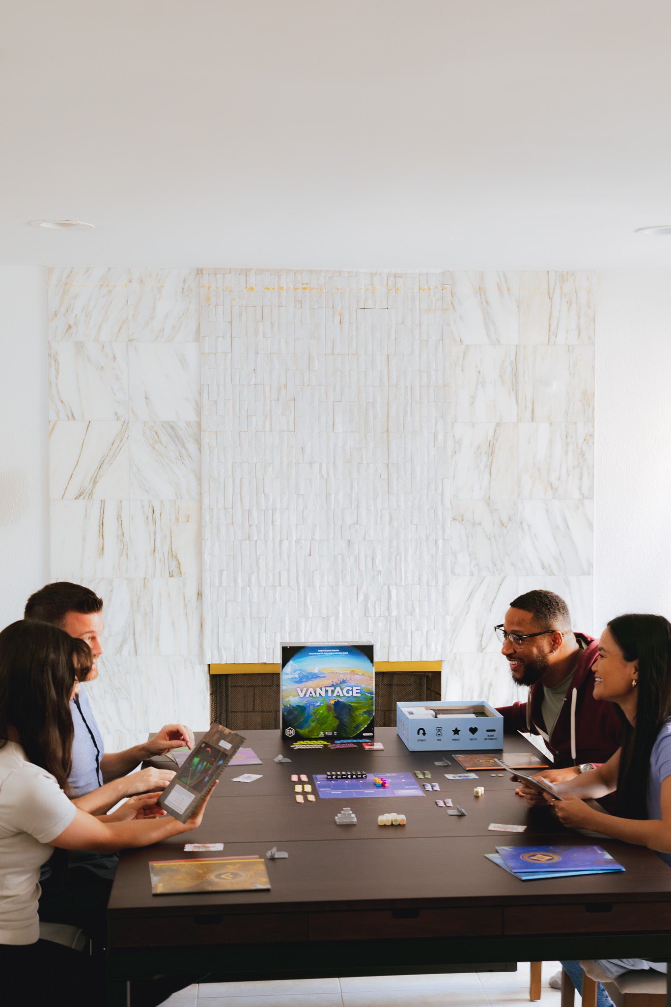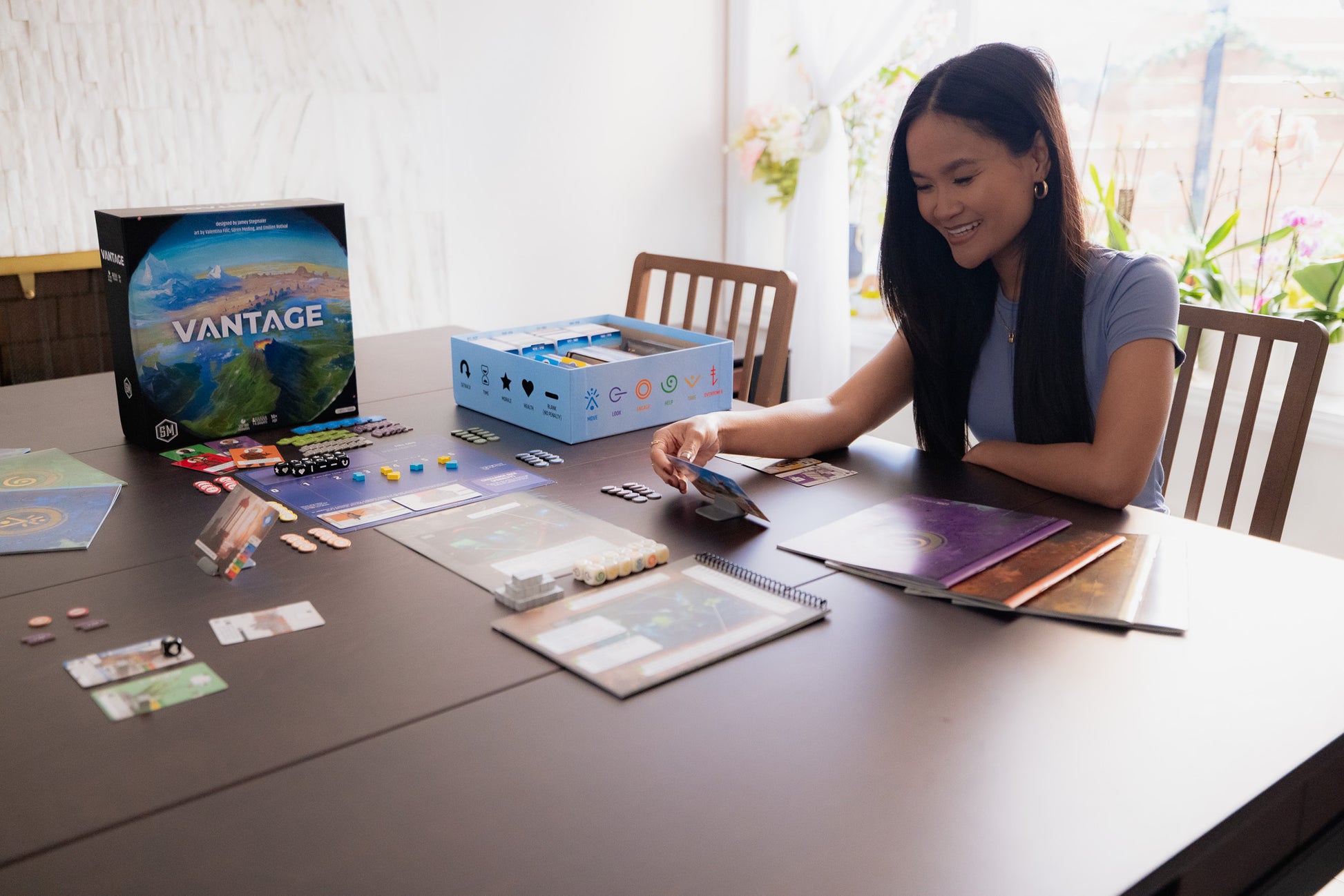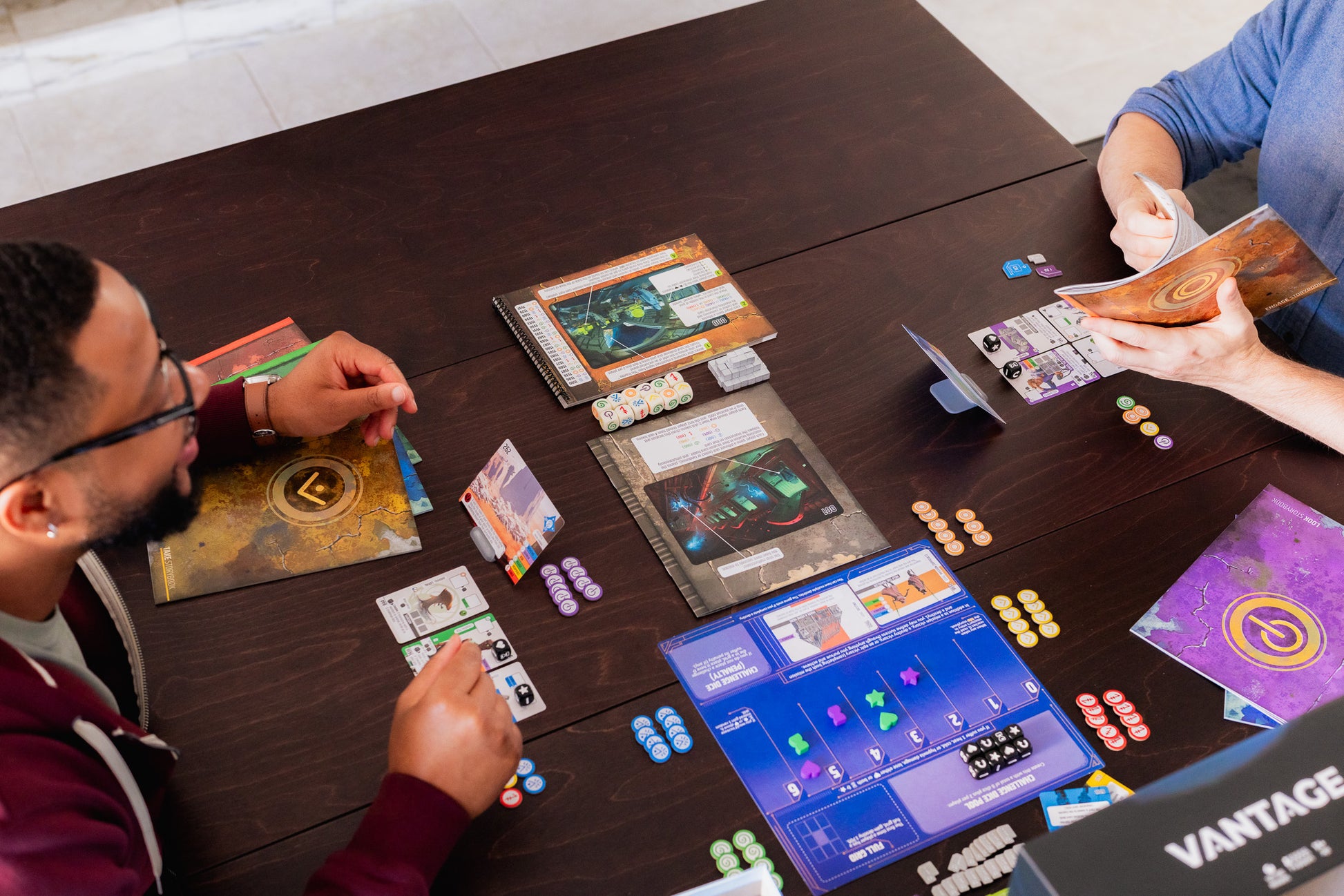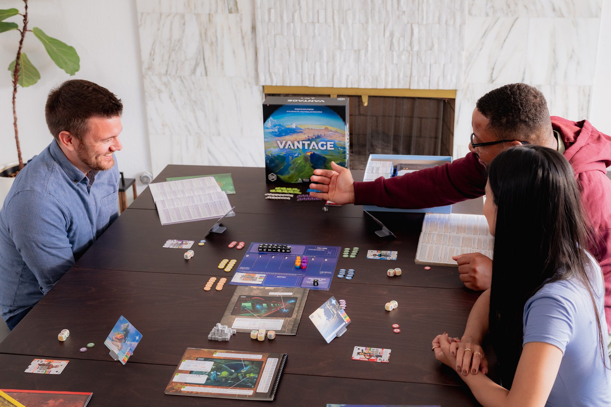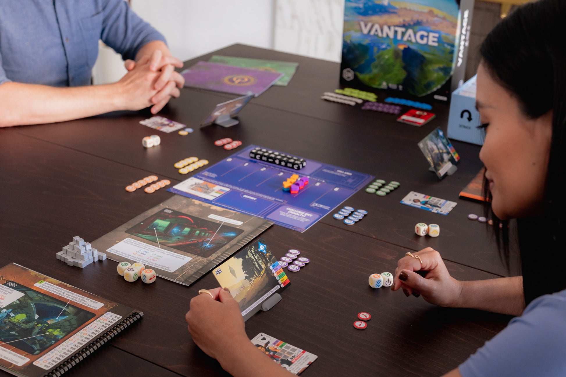Stonemaier’s Vantage is an open-world, cooperative adventure game featuring an entire planet to explore in standalone sessions that begin with players scattered randomly across the world. With nearly 800 interconnected locations on cards and over 900 other discoverable cards, the world is your sandbox.