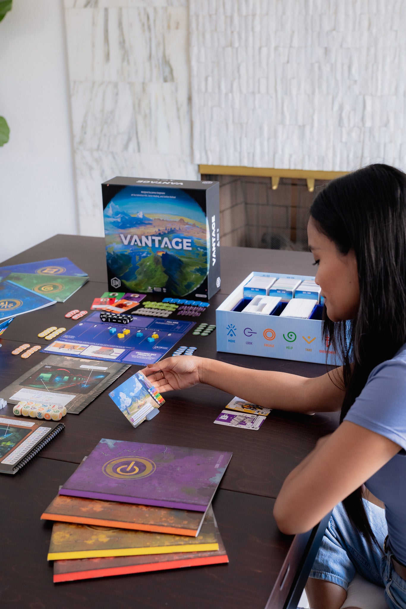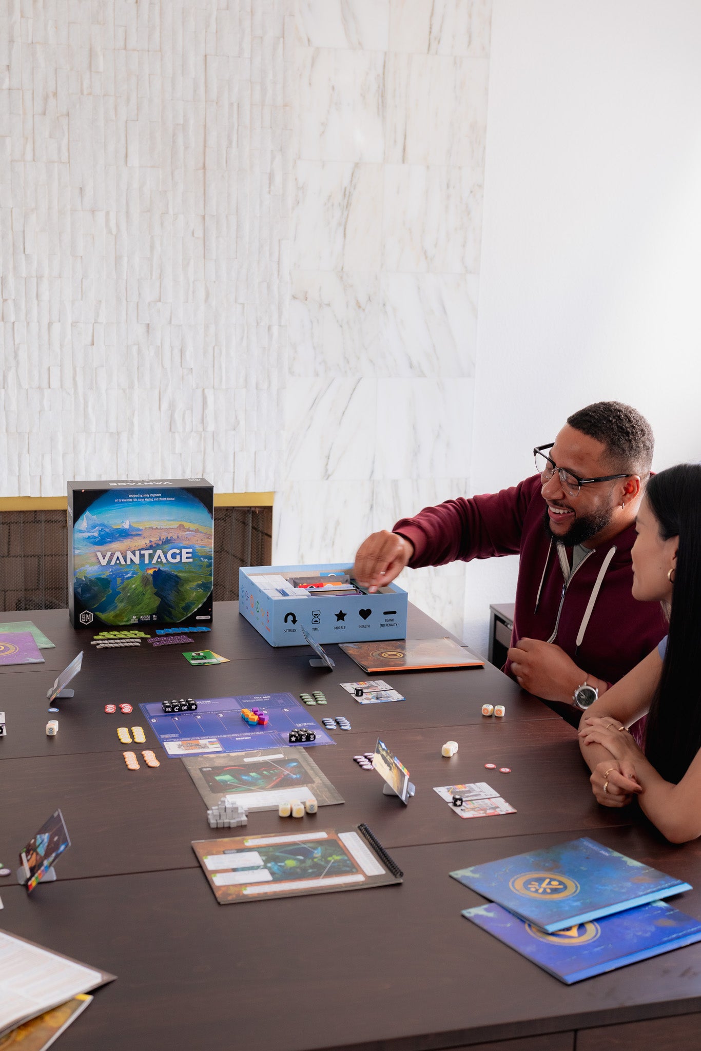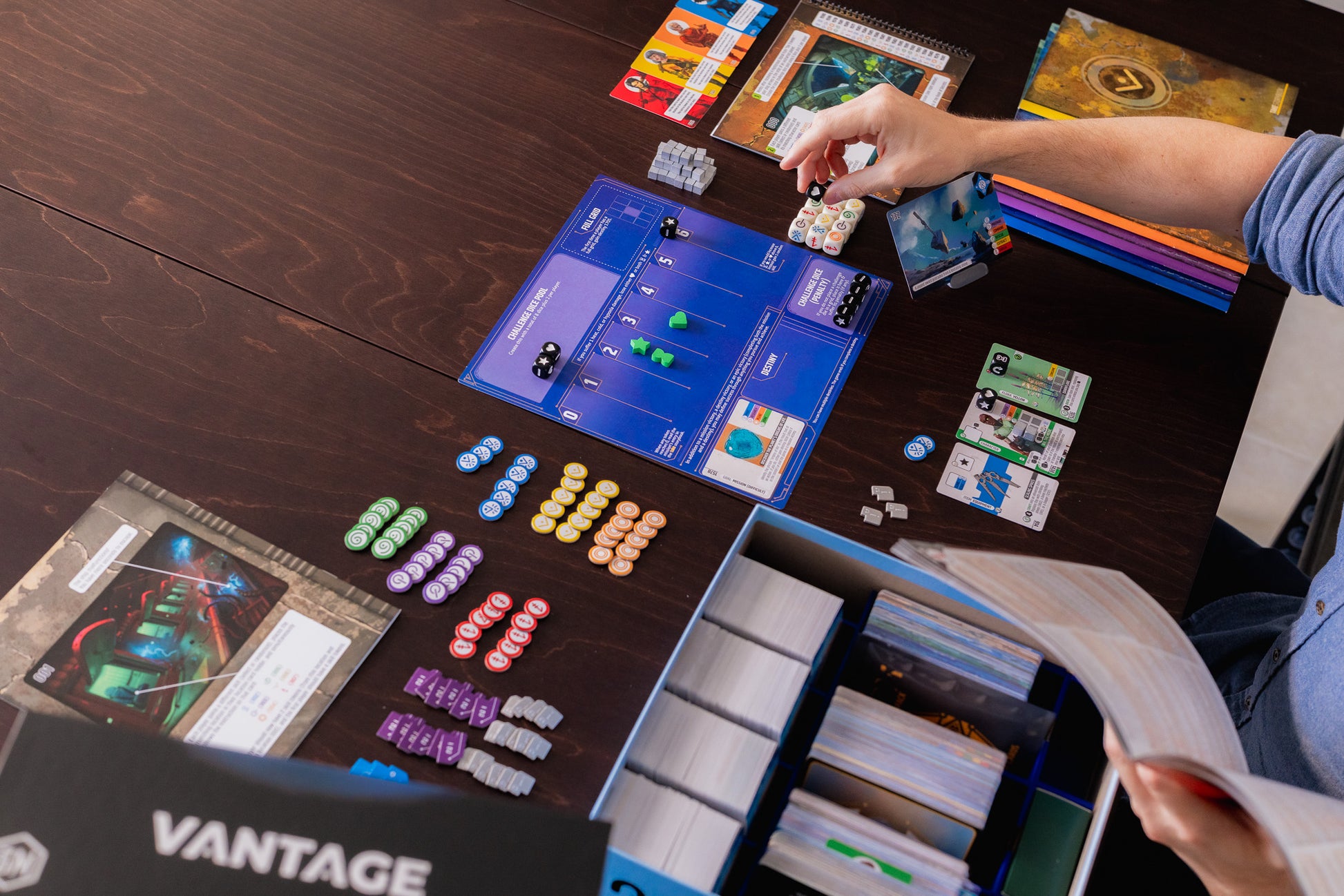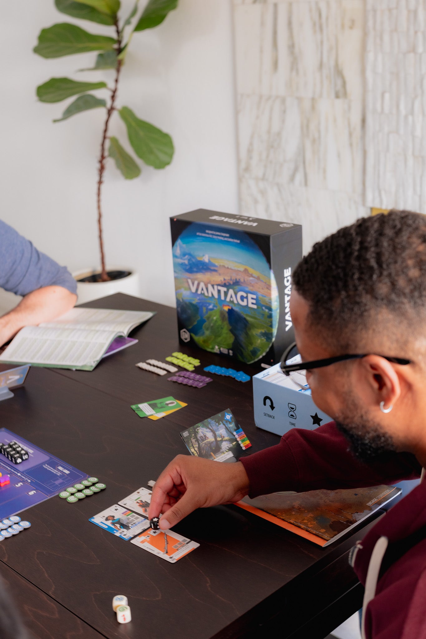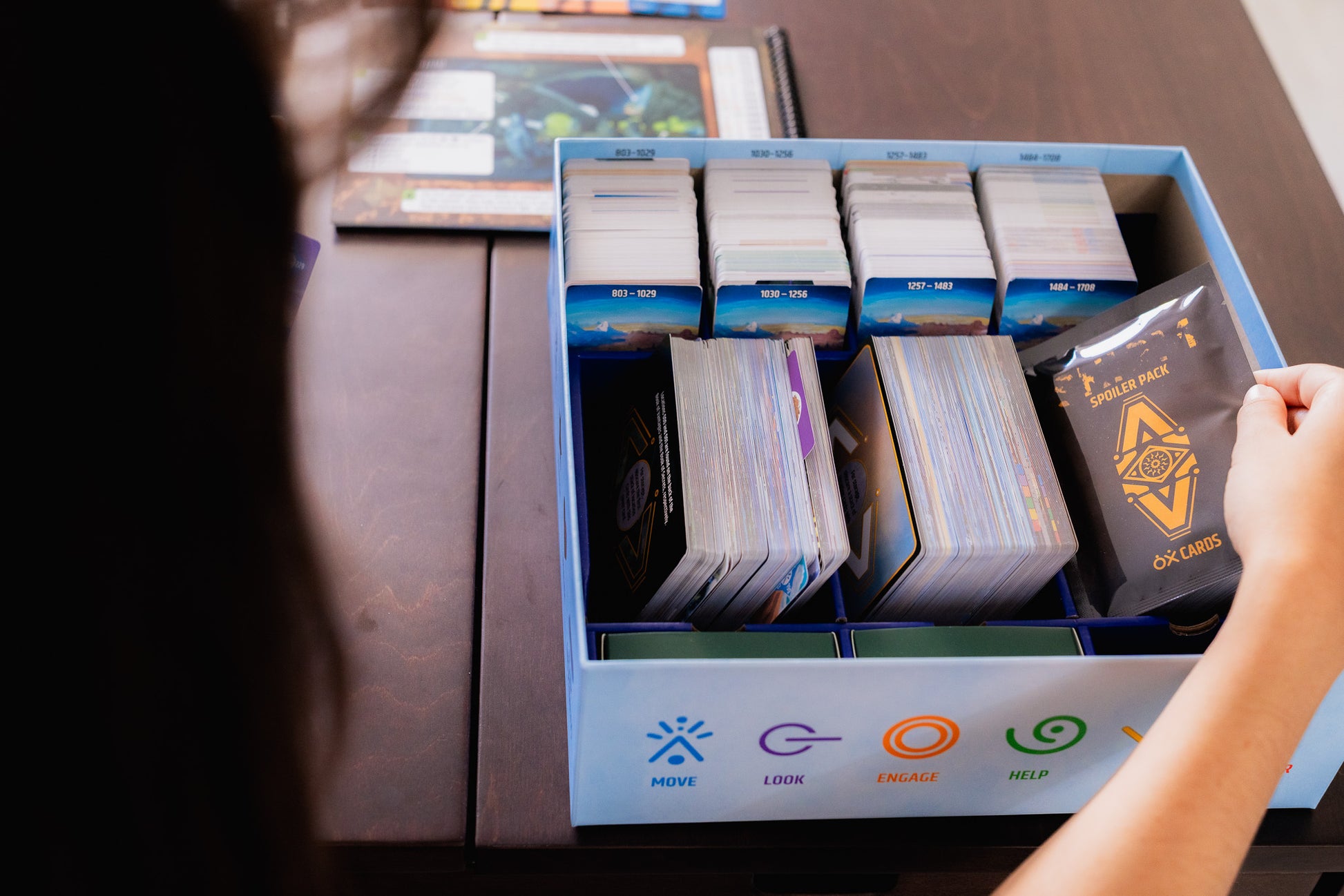 Stonemaier’s Vantage is an open-world, cooperative adventure game featuring an entire planet to explore in standalone sessions that begin with players scattered randomly across the world. With nearly 800 interconnected locations on cards and over 900 other discoverable cards, the world is your sandbox.