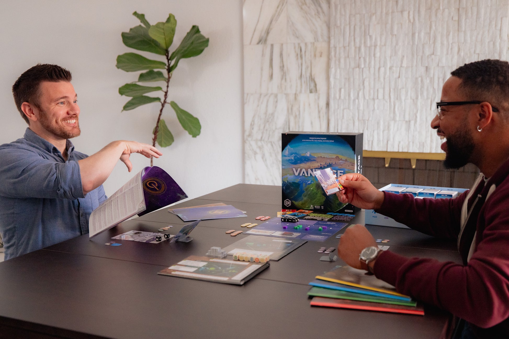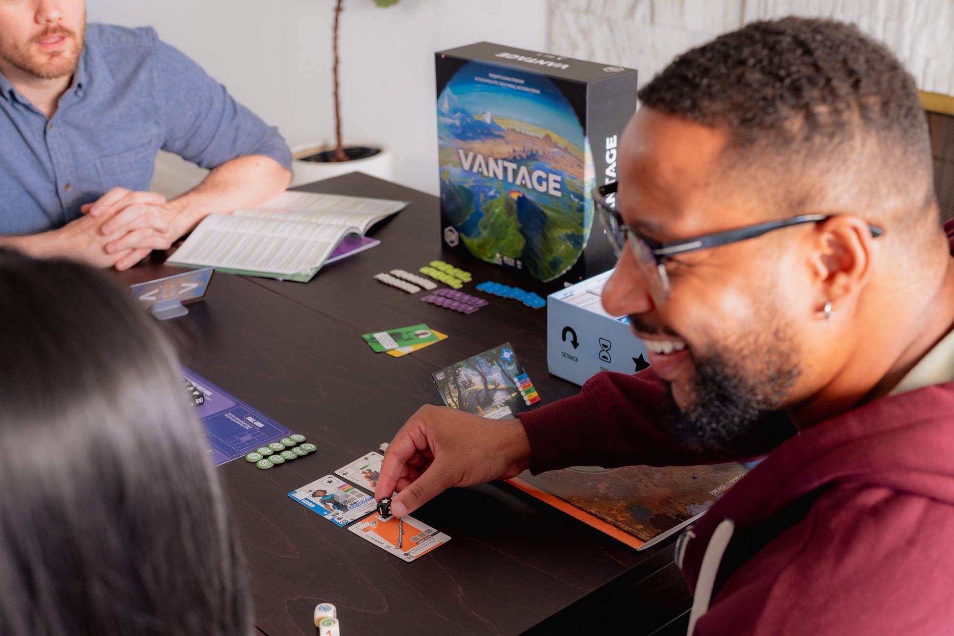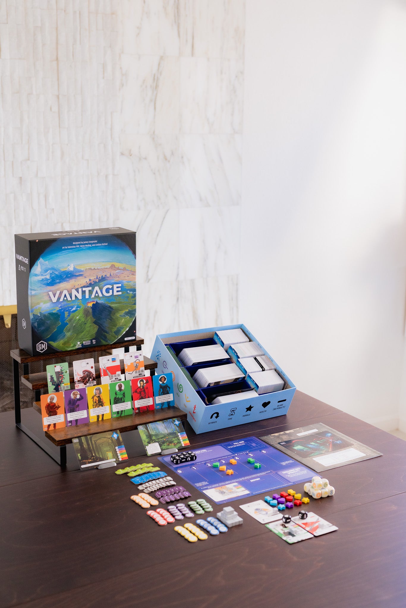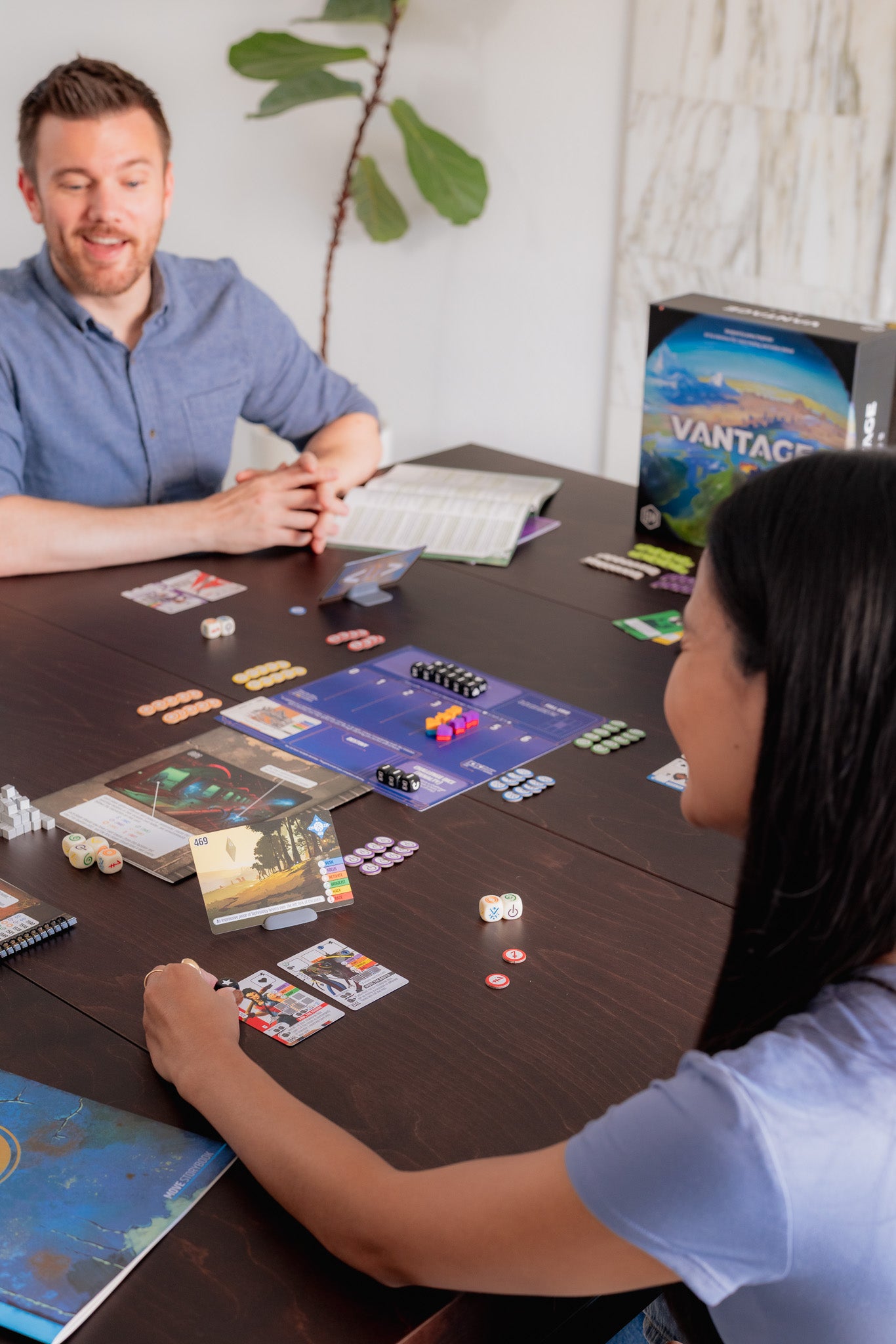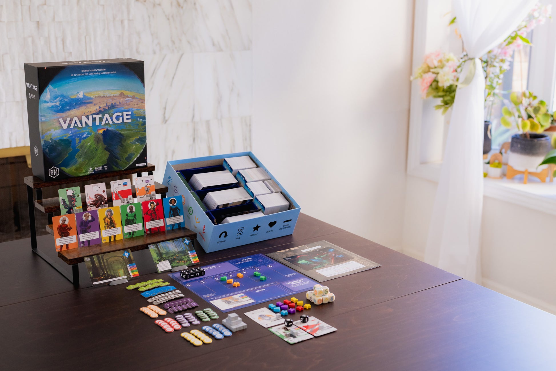 Stonemaier’s Vantage is an open-world, cooperative adventure game featuring an entire planet to explore in standalone sessions that begin with players scattered randomly across the world. With nearly 800 interconnected locations on cards and over 900 other discoverable cards, the world is your sandbox.