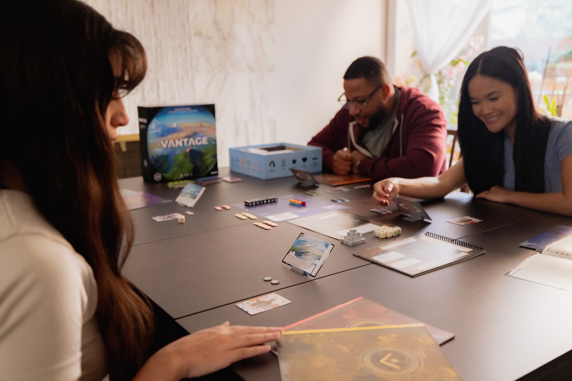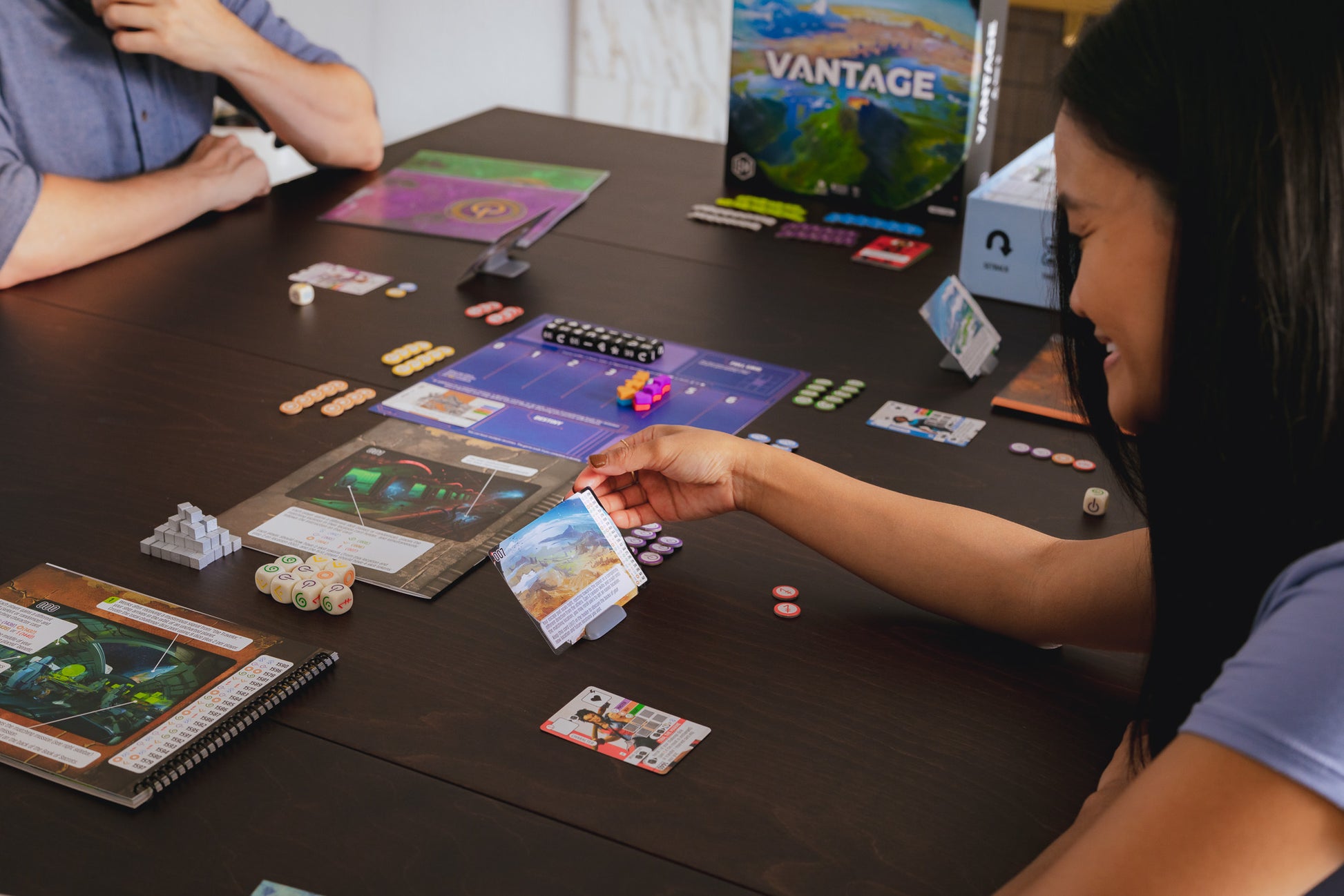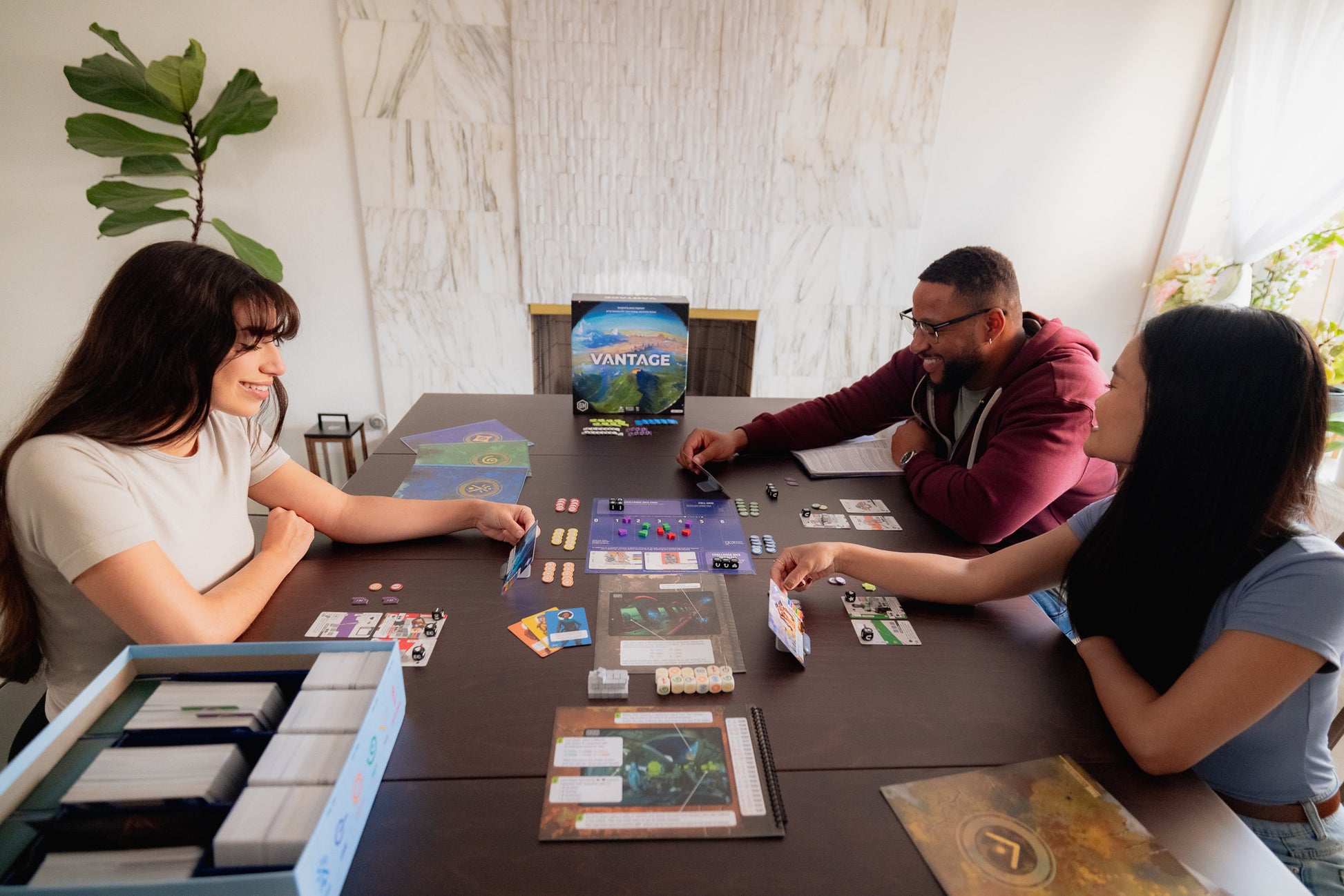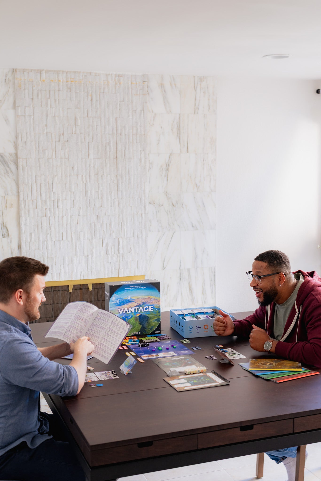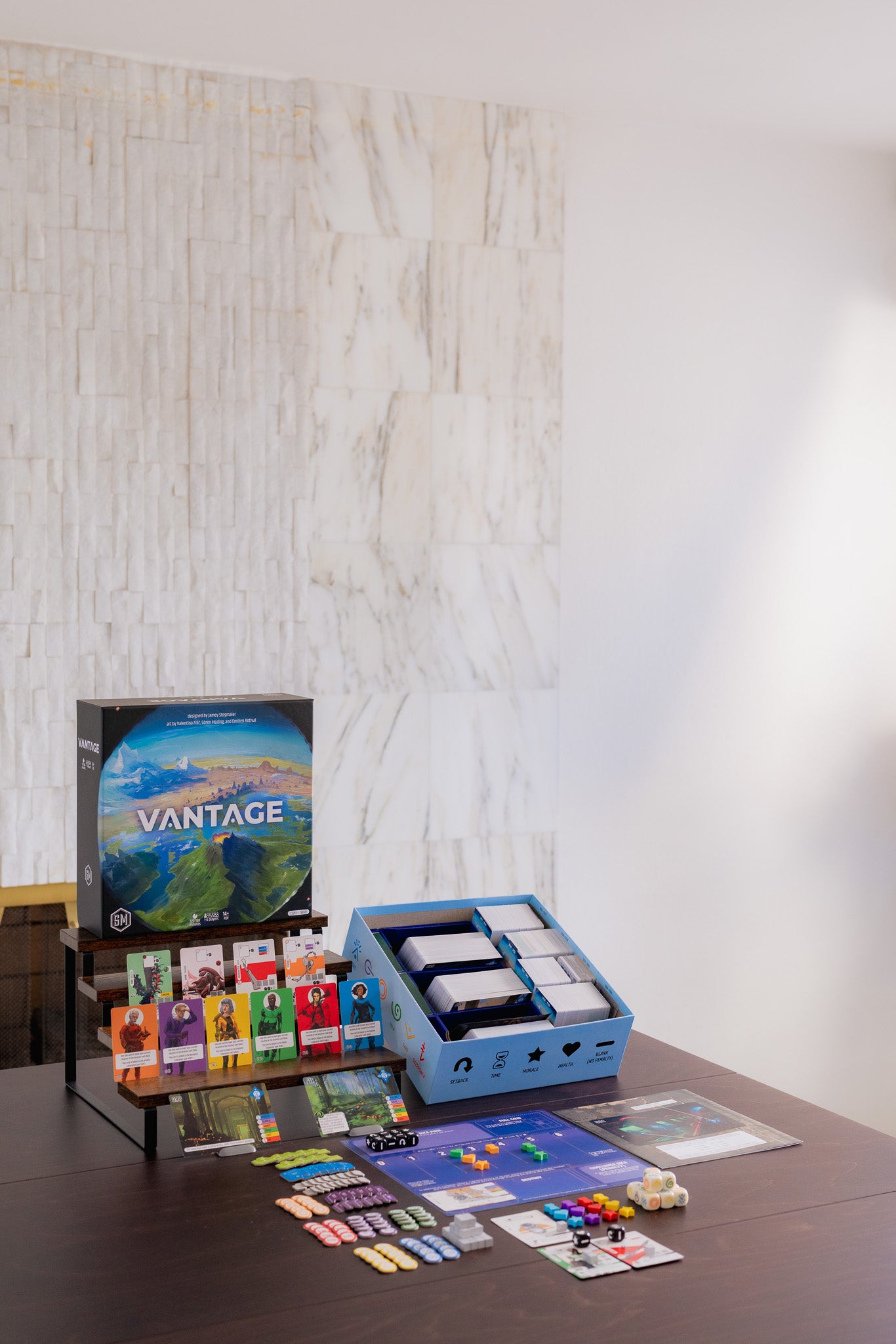 Stonemaier’s Vantage is an open-world, cooperative adventure game featuring an entire planet to explore in standalone sessions that begin with players scattered randomly across the world. With nearly 800 interconnected locations on cards and over 900 other discoverable cards, the world is your sandbox.