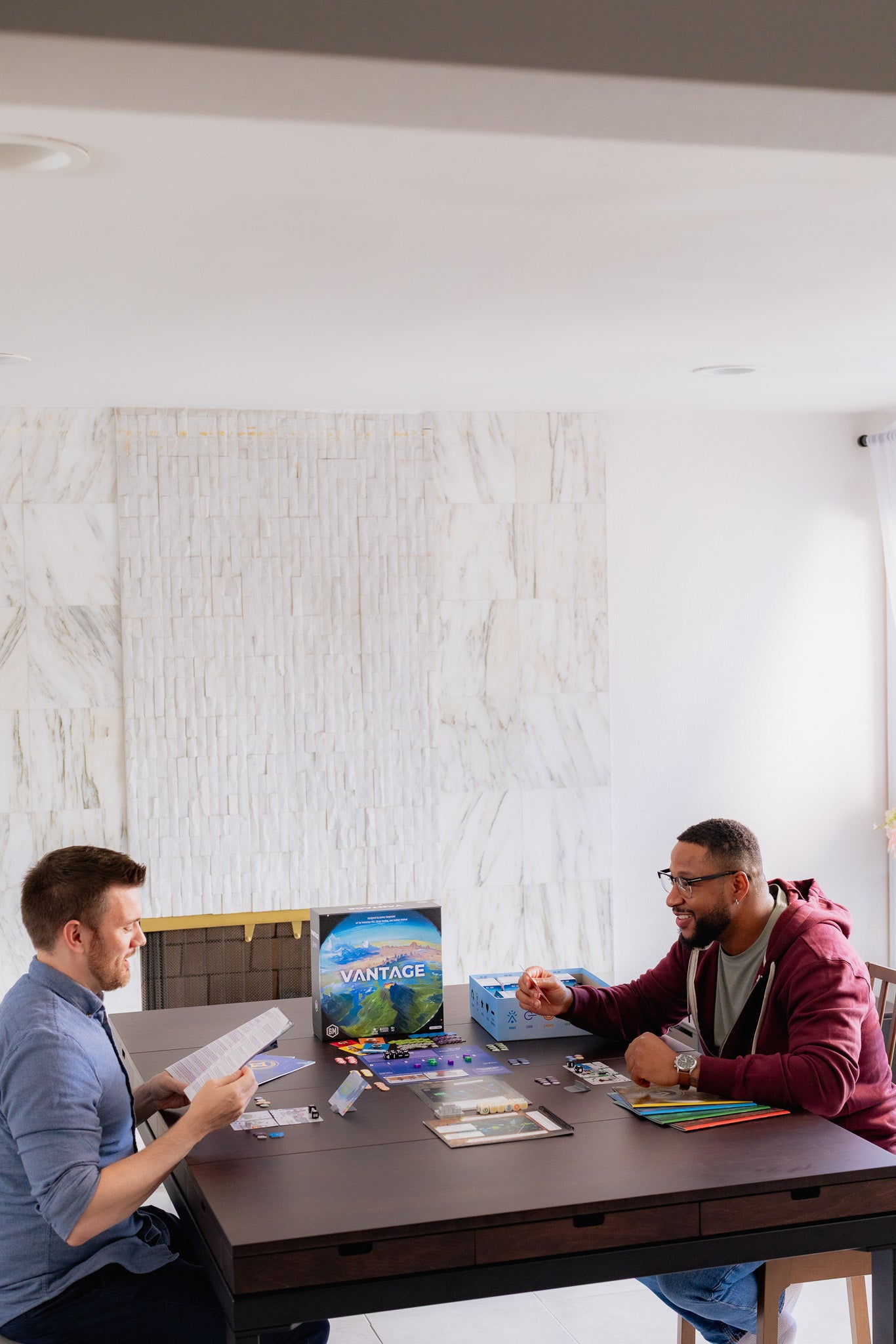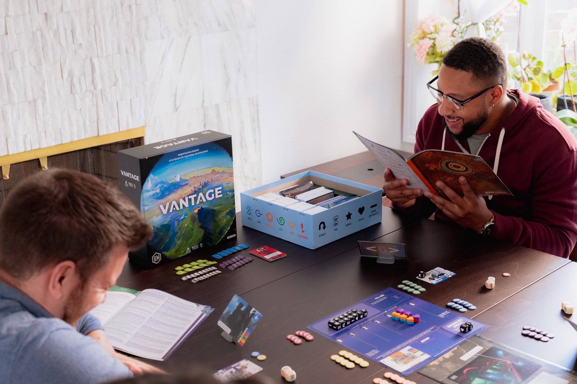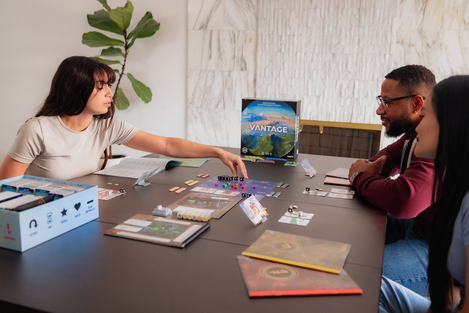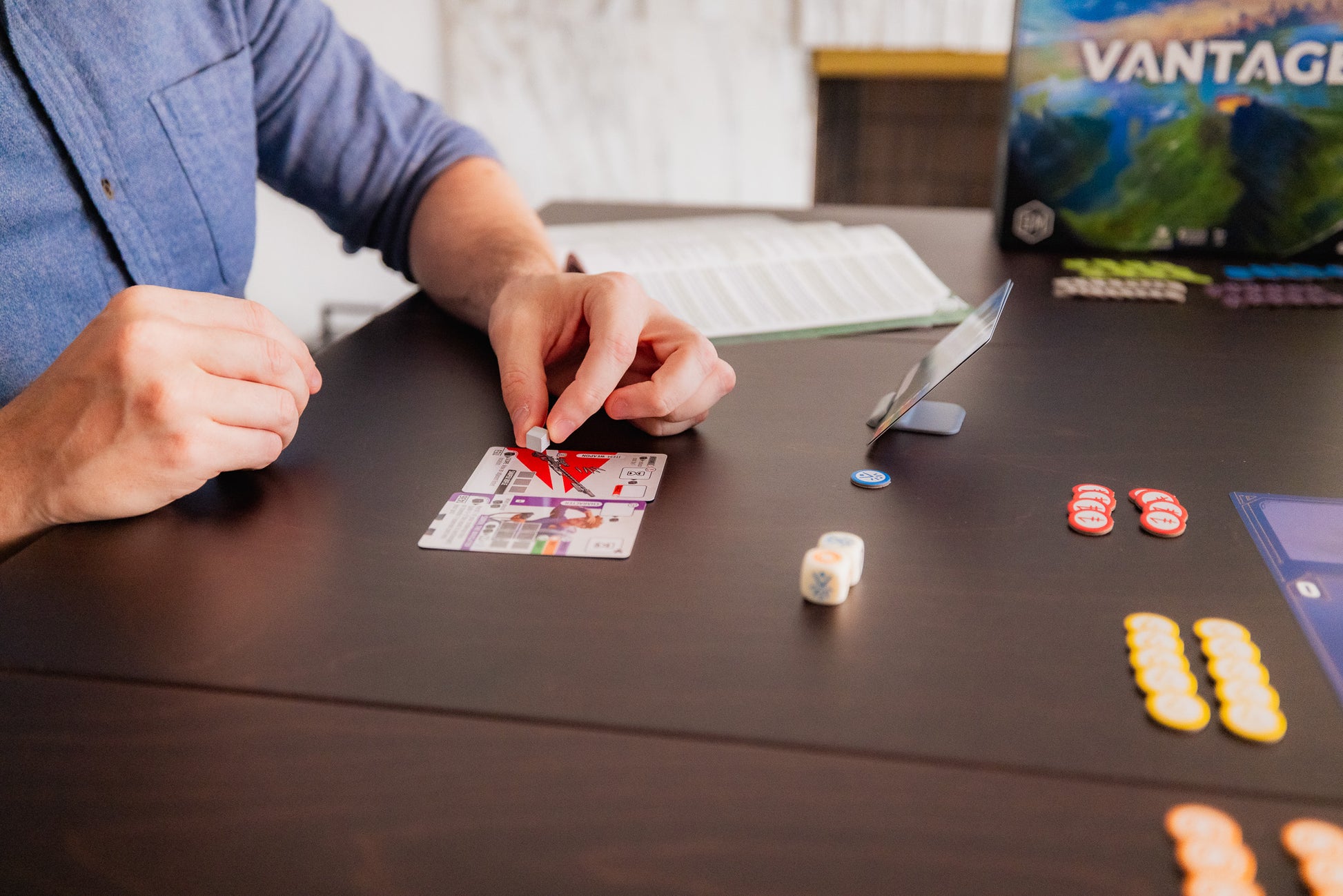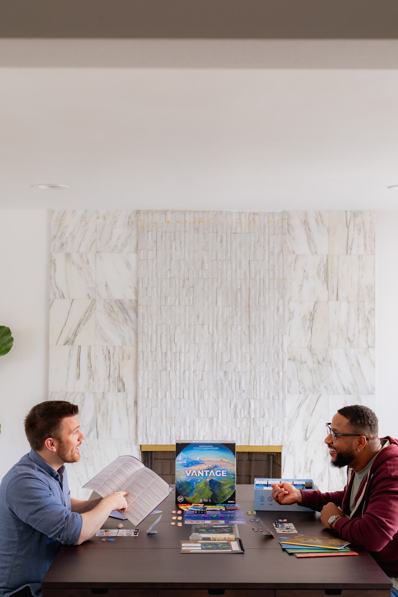 Stonemaier’s Vantage is an open-world, cooperative adventure game featuring an entire planet to explore in standalone sessions that begin with players scattered randomly across the world. With nearly 800 interconnected locations on cards and over 900 other discoverable cards, the world is your sandbox.