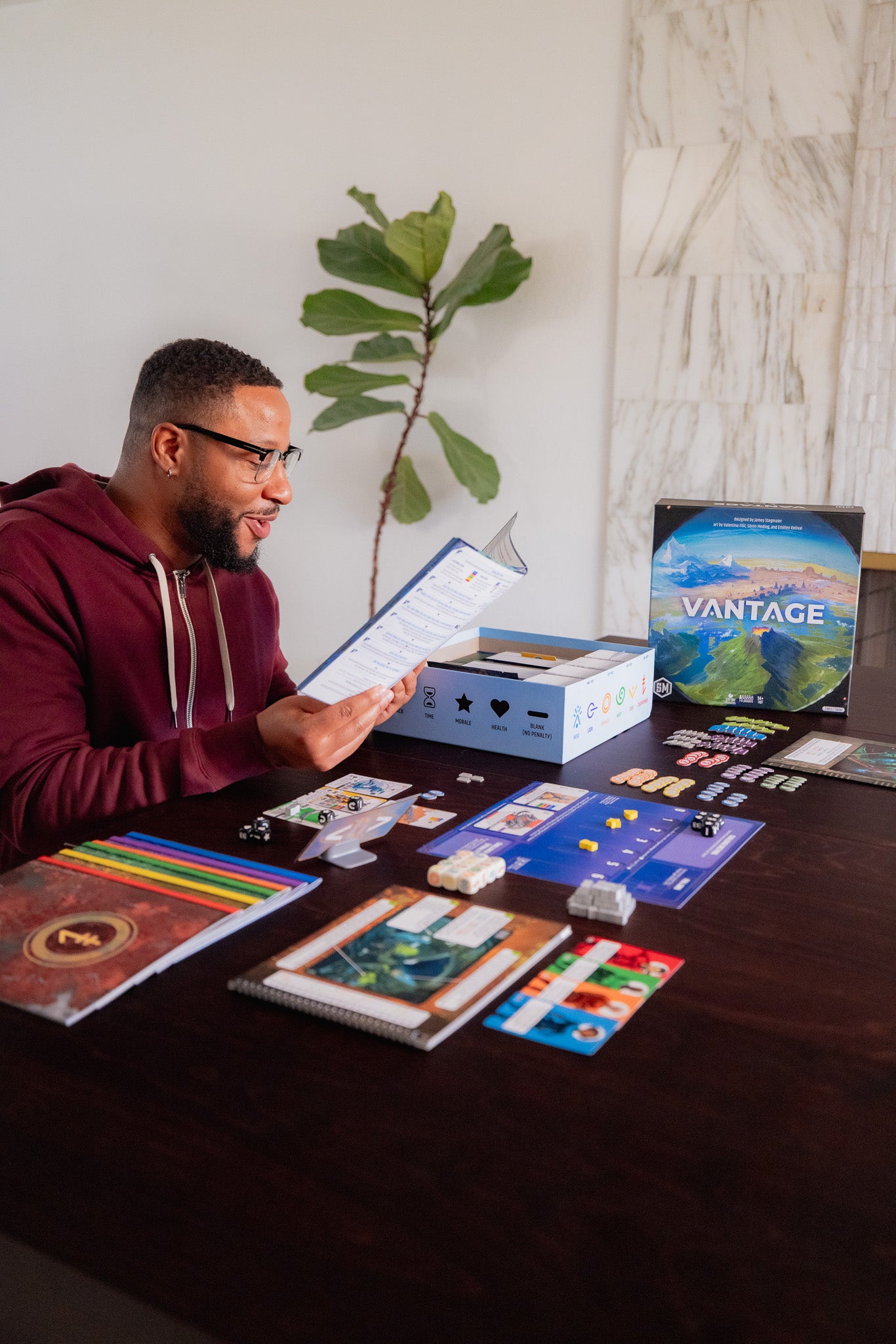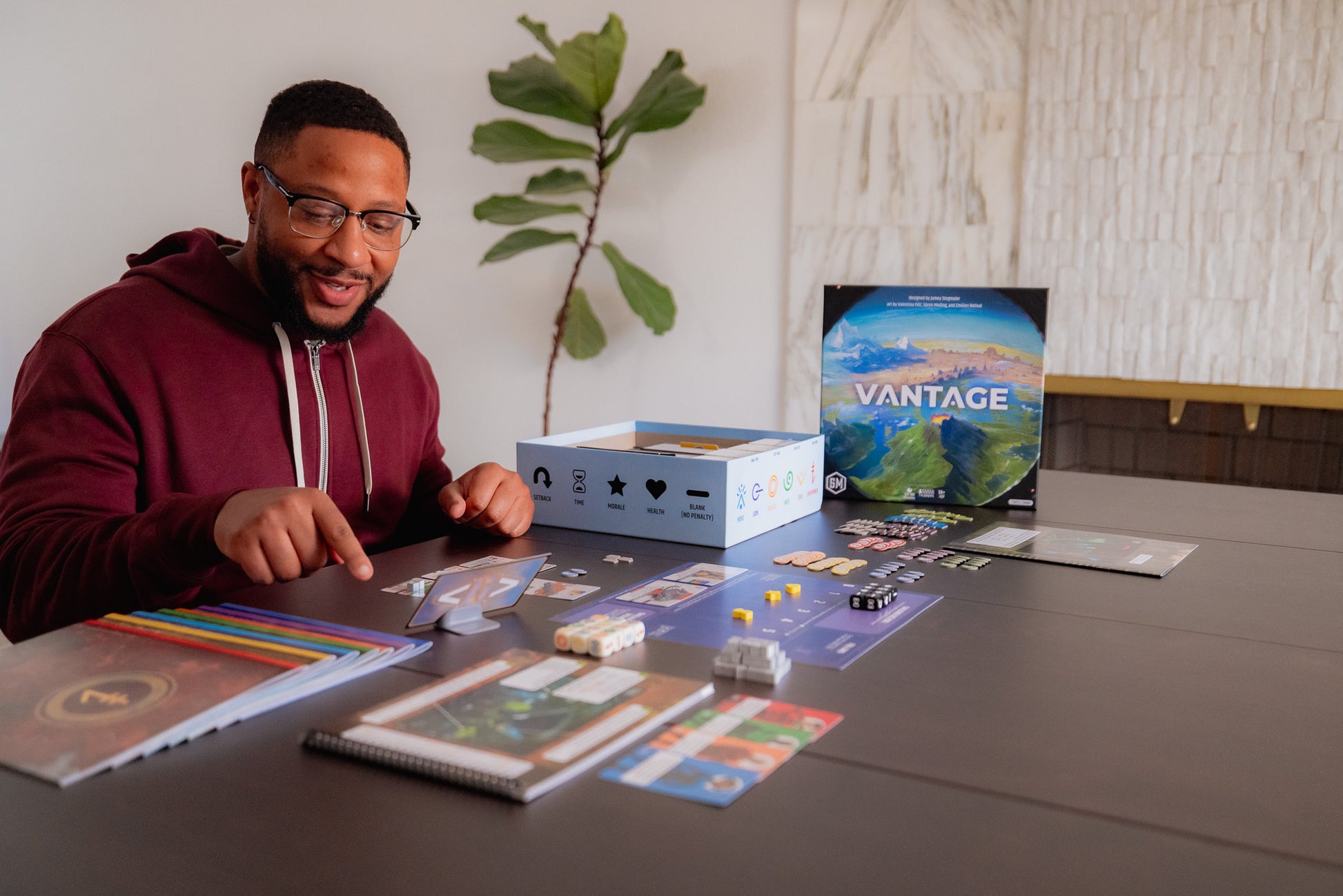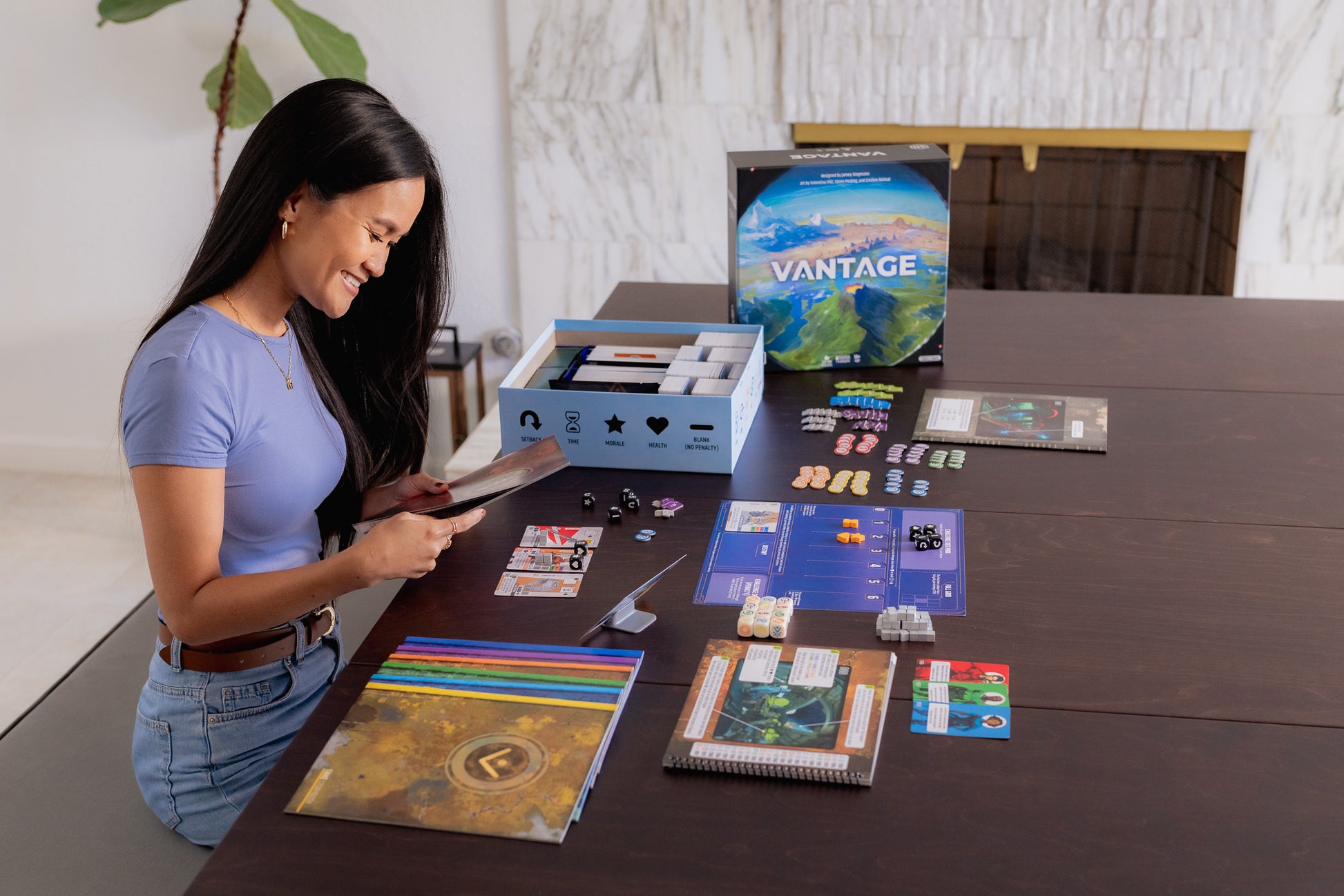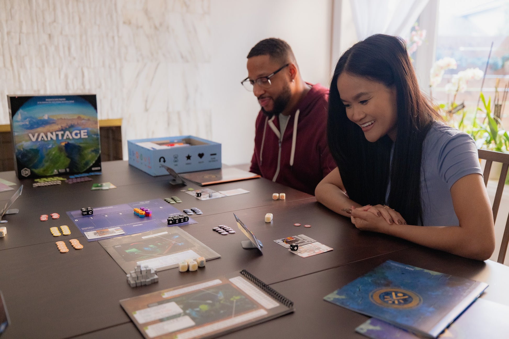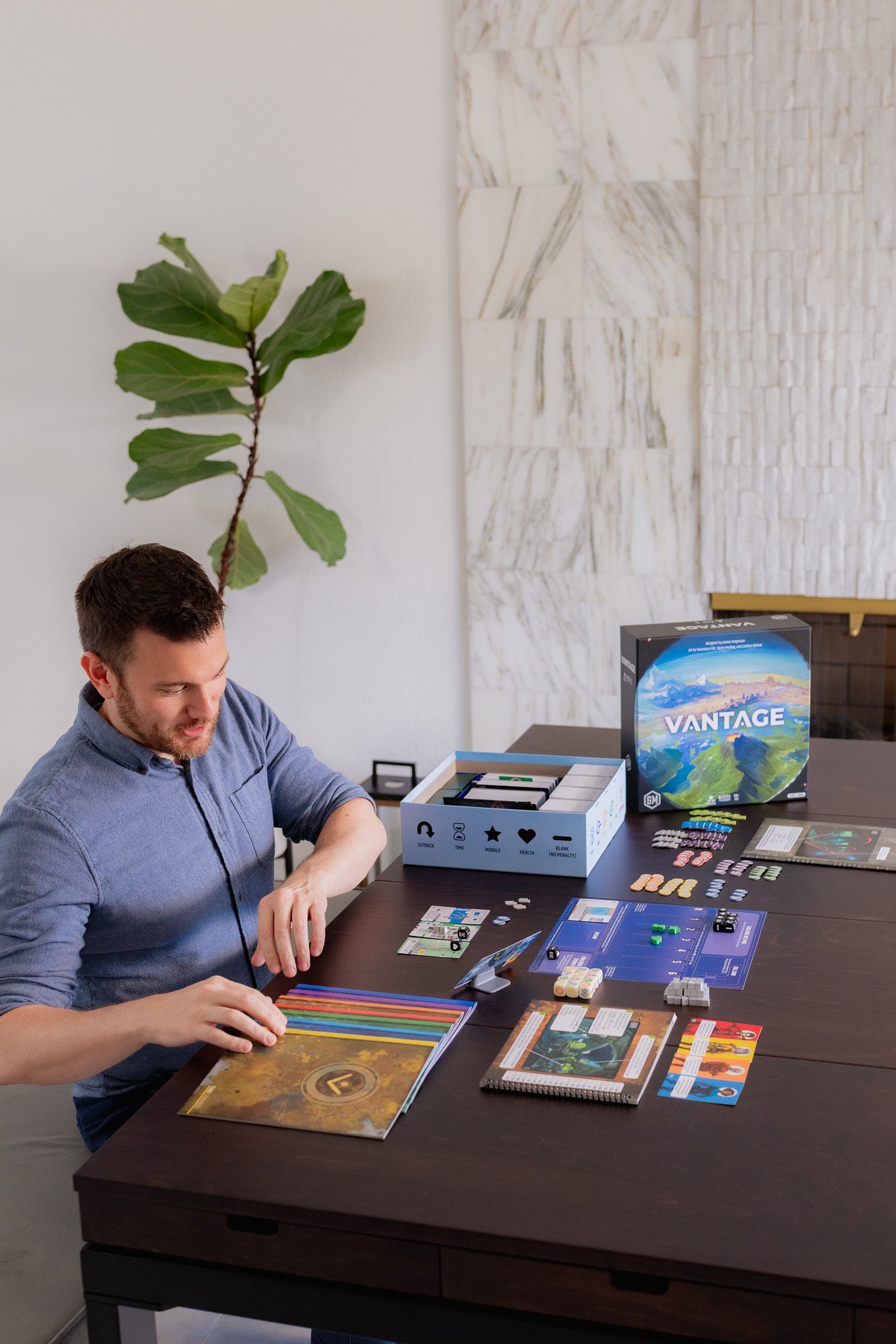 Stonemaier’s Vantage is an open-world, cooperative adventure game featuring an entire planet to explore in standalone sessions that begin with players scattered randomly across the world. With nearly 800 interconnected locations on cards and over 900 other discoverable cards, the world is your sandbox.