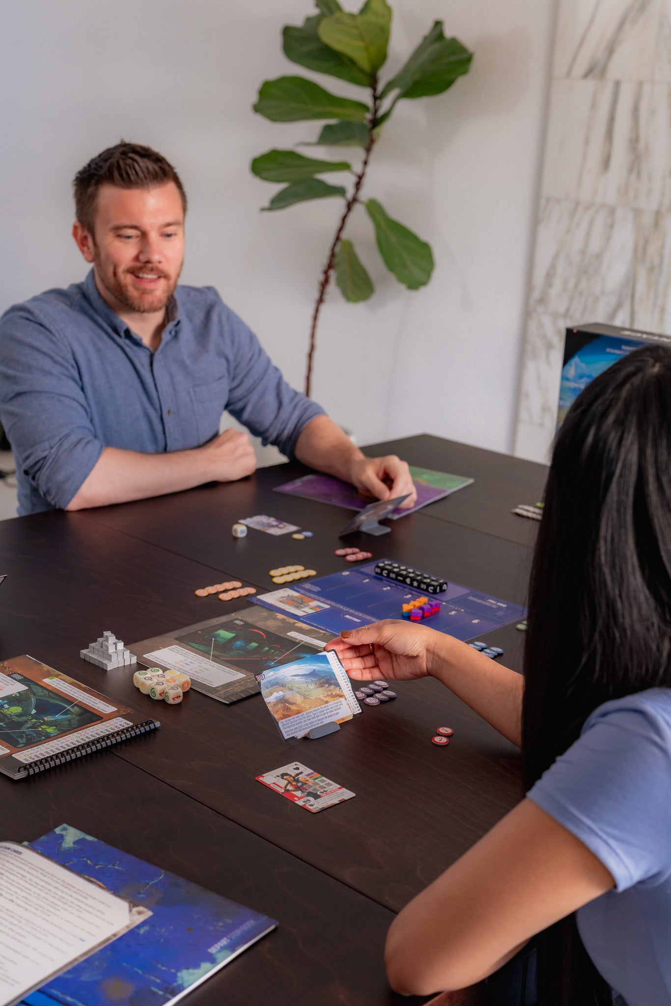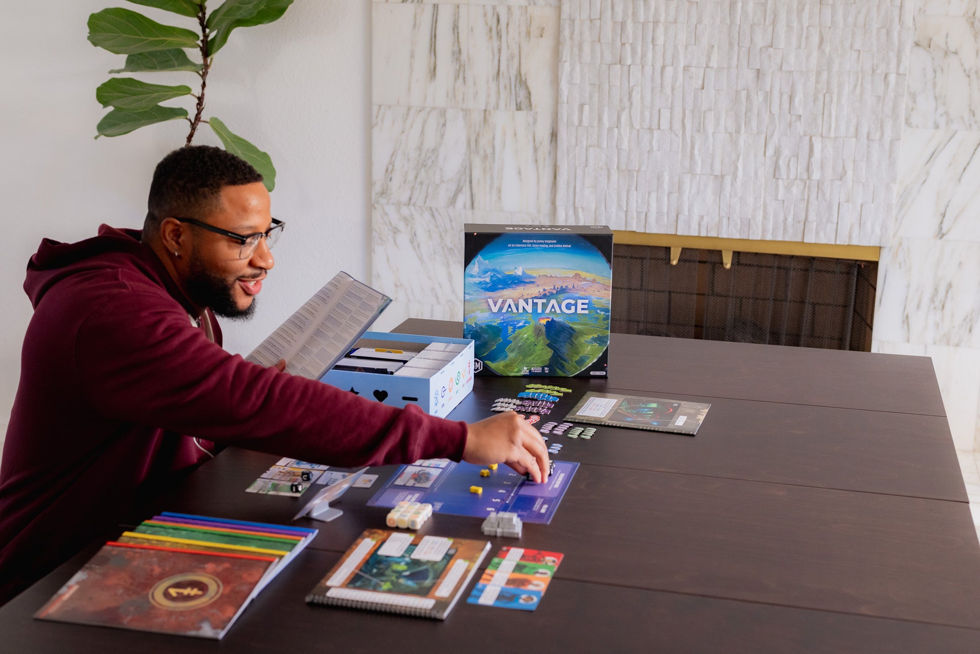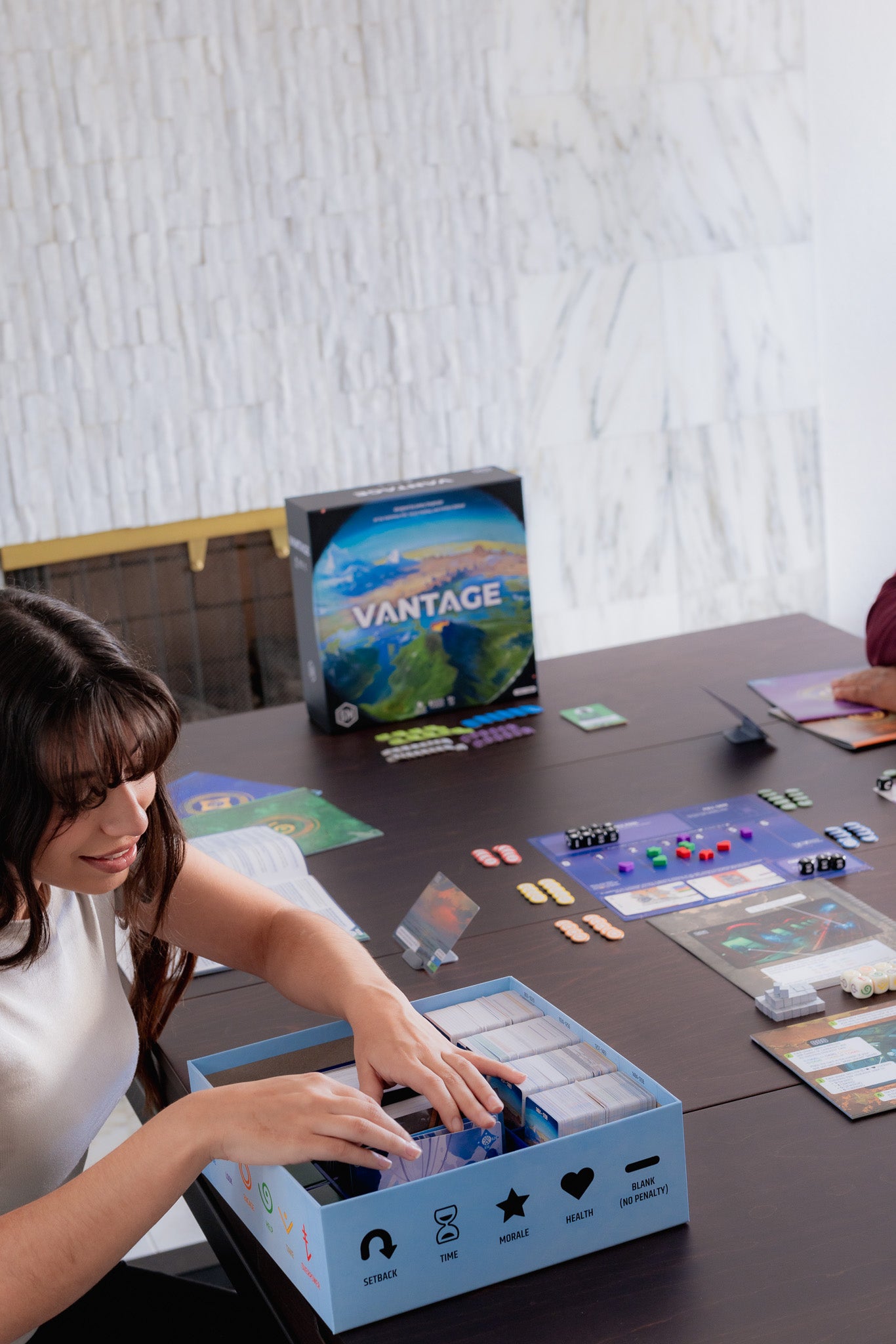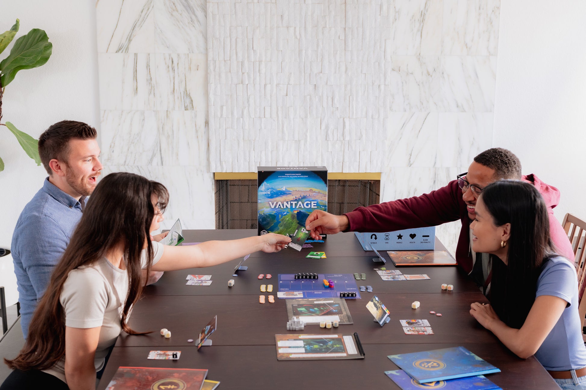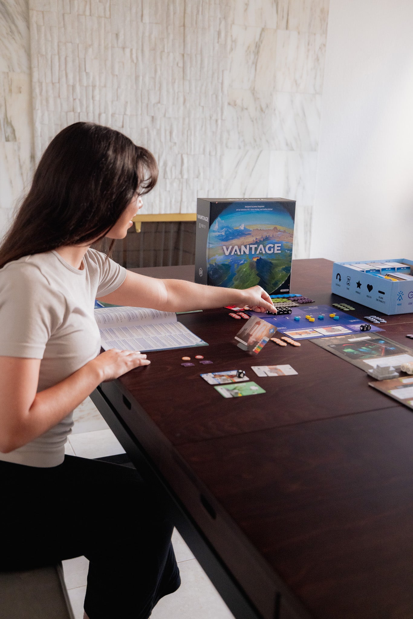 Stonemaier’s Vantage is an open-world, cooperative adventure game featuring an entire planet to explore in standalone sessions that begin with players scattered randomly across the world. With nearly 800 interconnected locations on cards and over 900 other discoverable cards, the world is your sandbox.