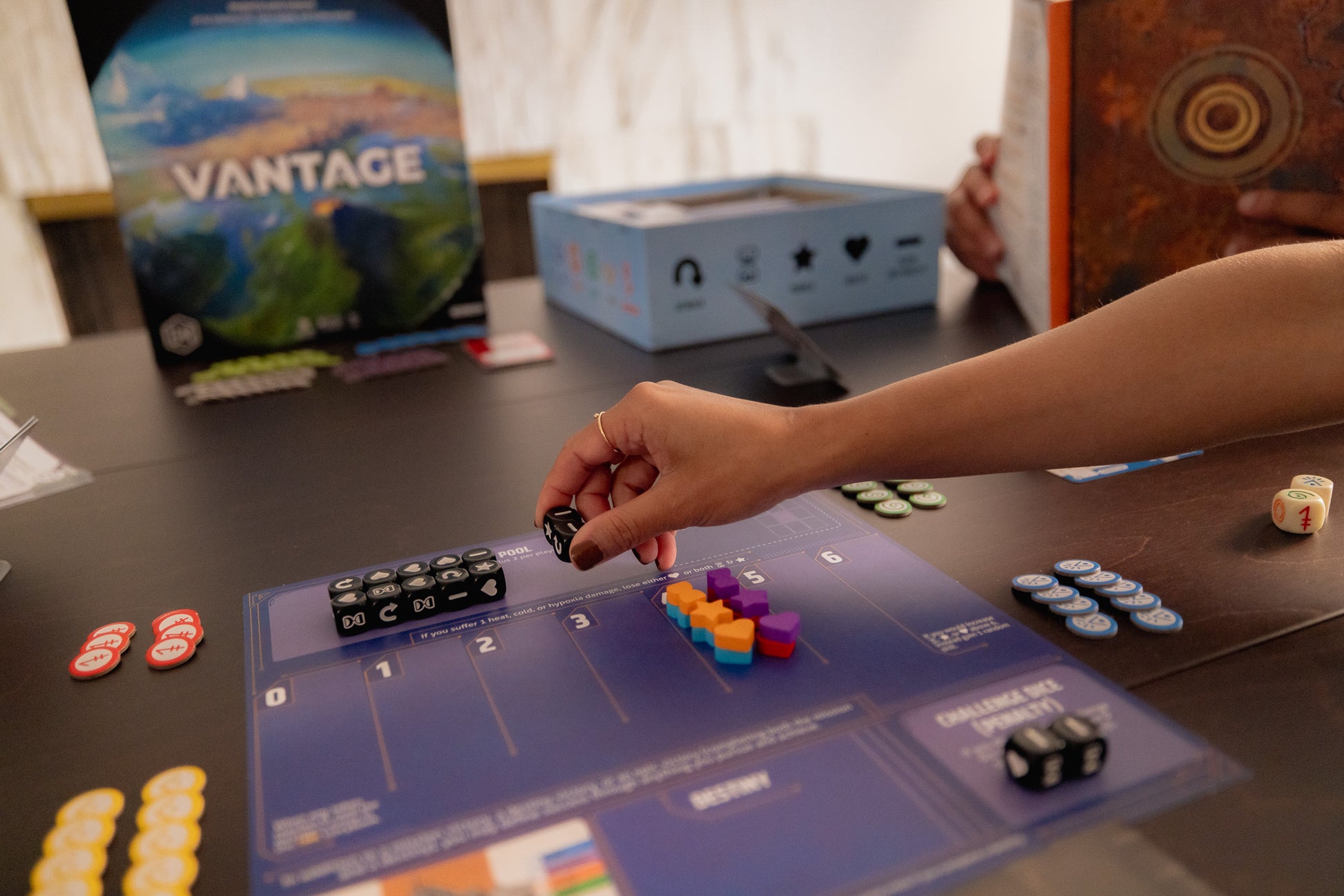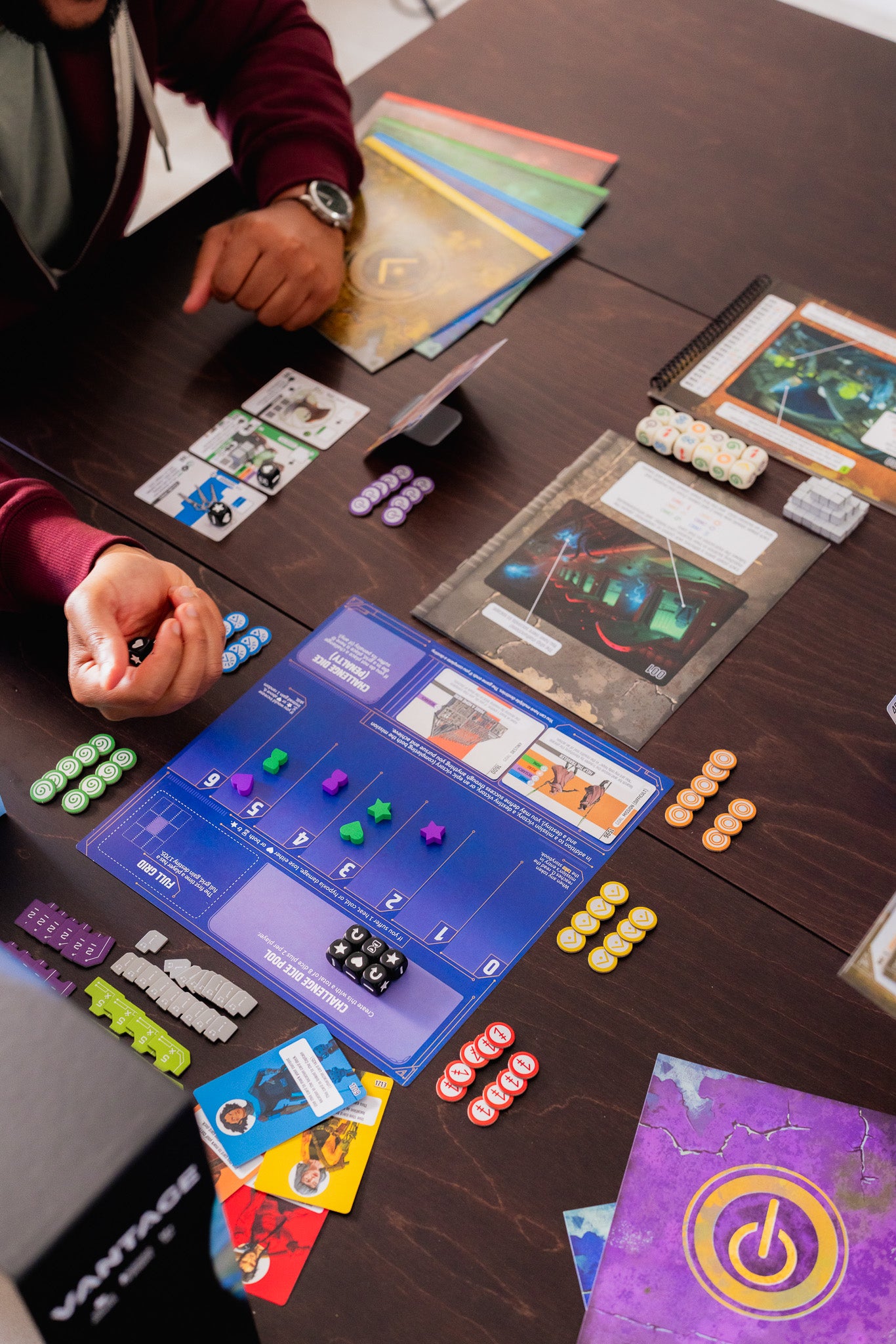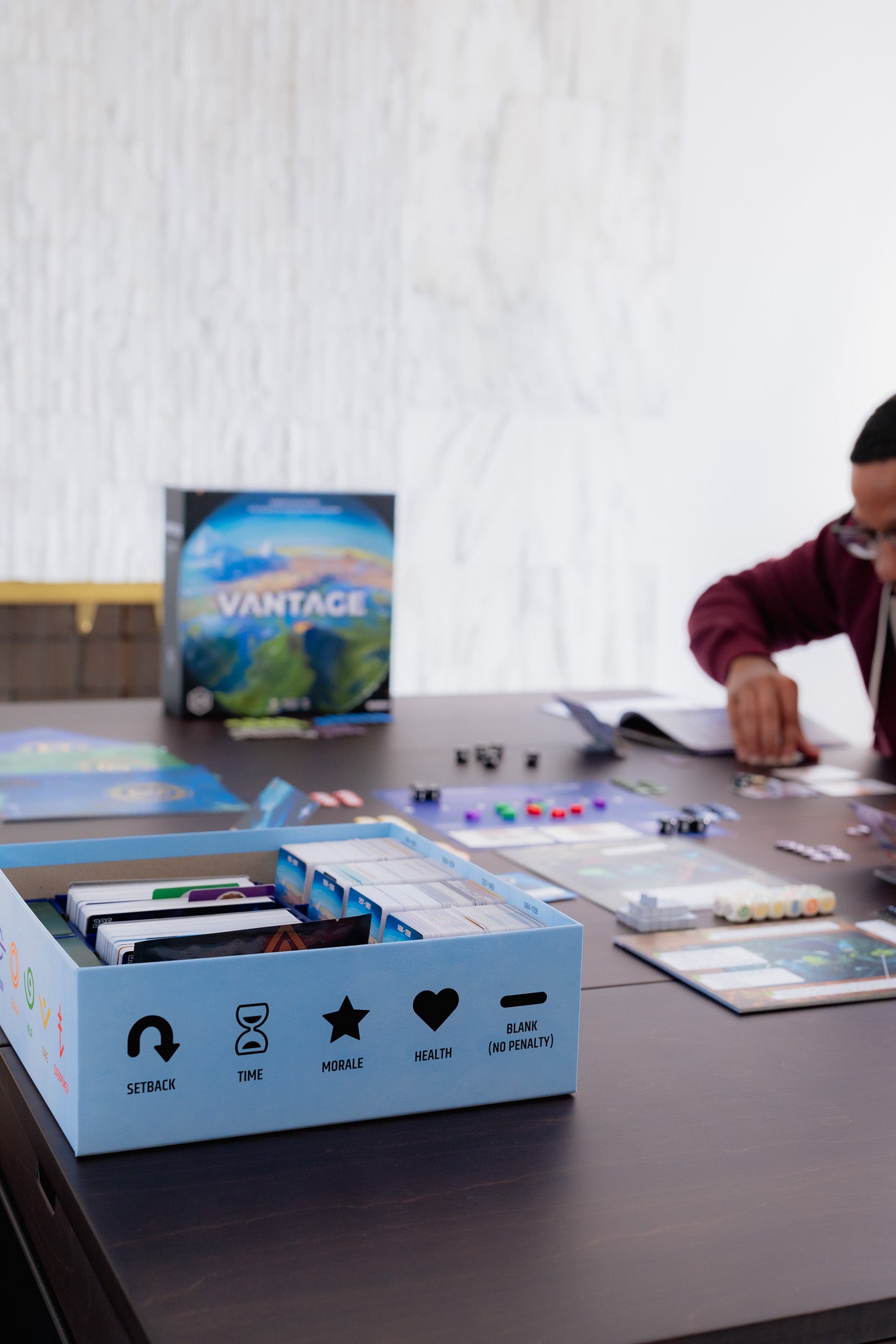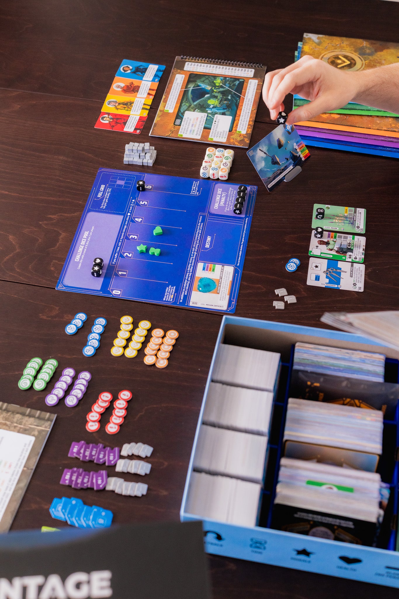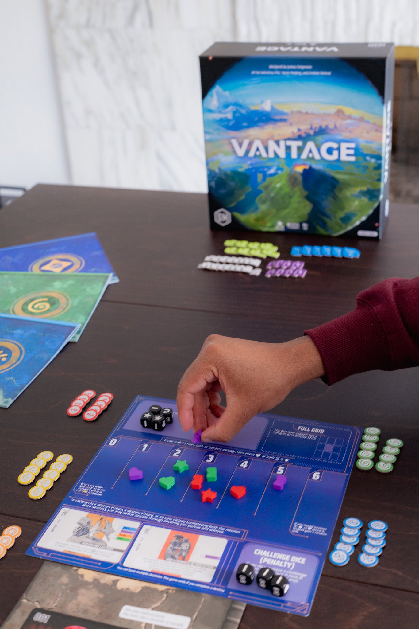 You begin each game of Vantage on an intergalactic vessel heading towards the same uncharted planet with 1 of 21 missions as your primary goal. Each player selects 1 of 6 unique characters, enters a single-person escape pod, and crashes onto 1 of 126 different locations.