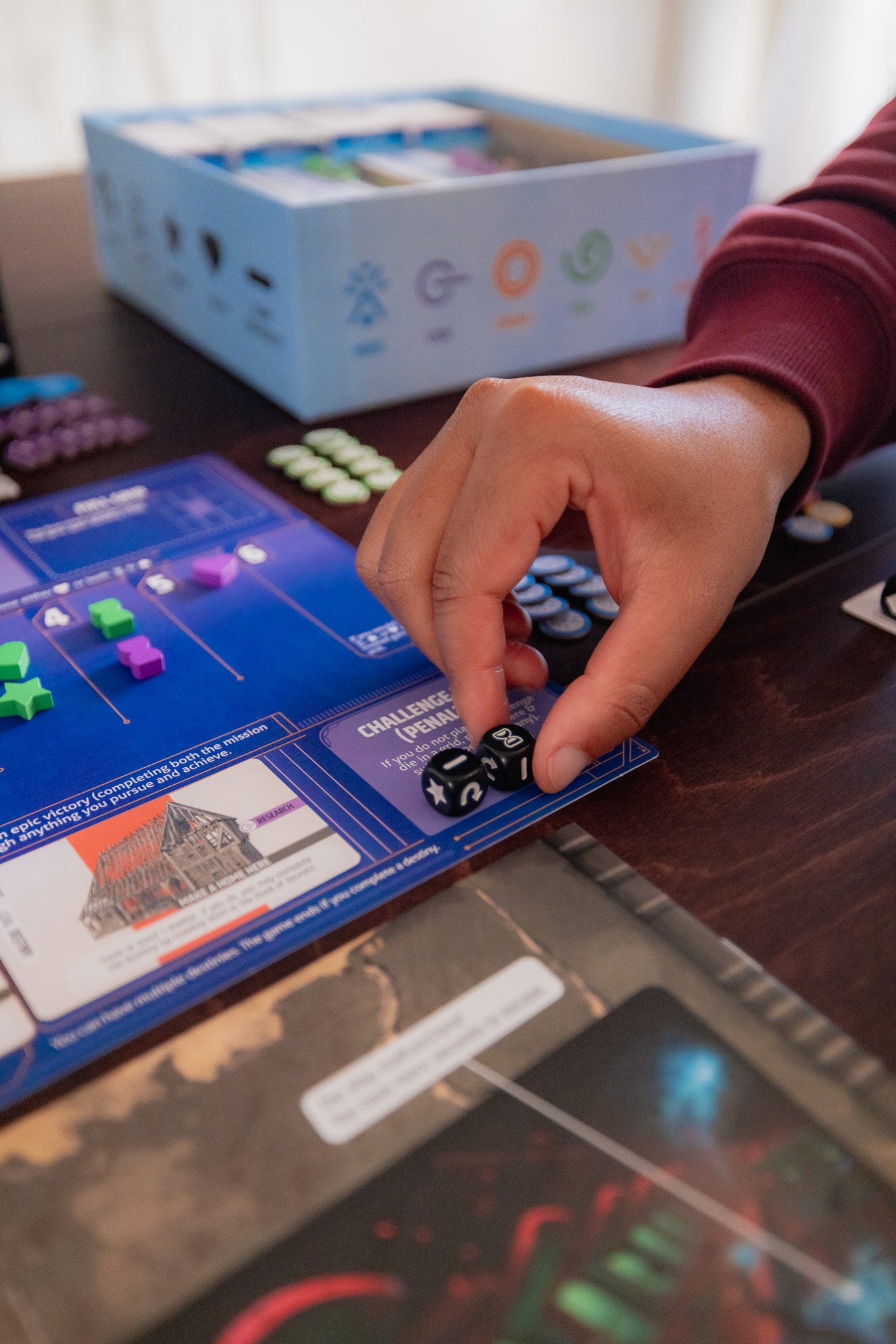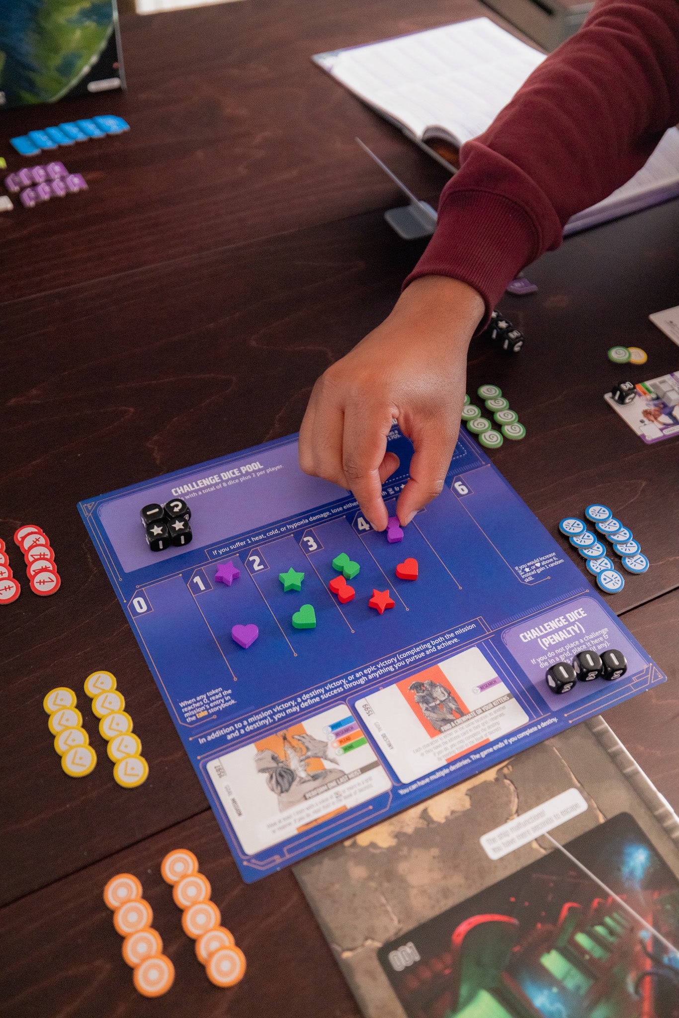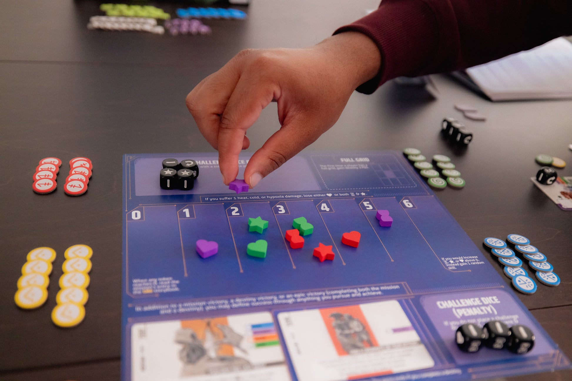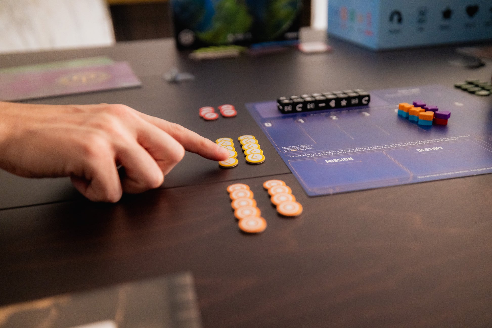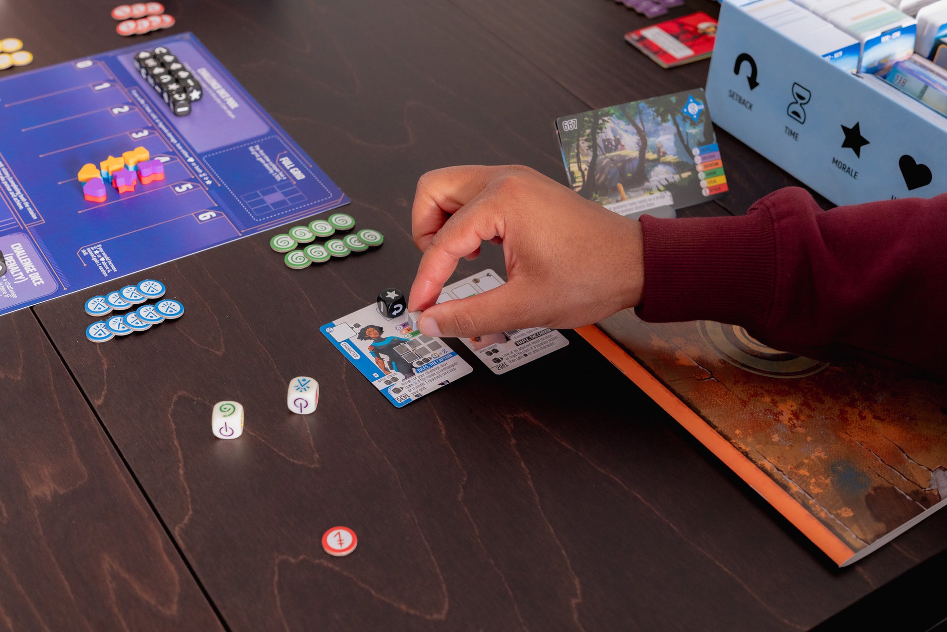 You begin each game of Vantage on an intergalactic vessel heading towards the same uncharted planet with 1 of 21 missions as your primary goal. Each player selects 1 of 6 unique characters, enters a single-person escape pod, and crashes onto 1 of 126 different locations.